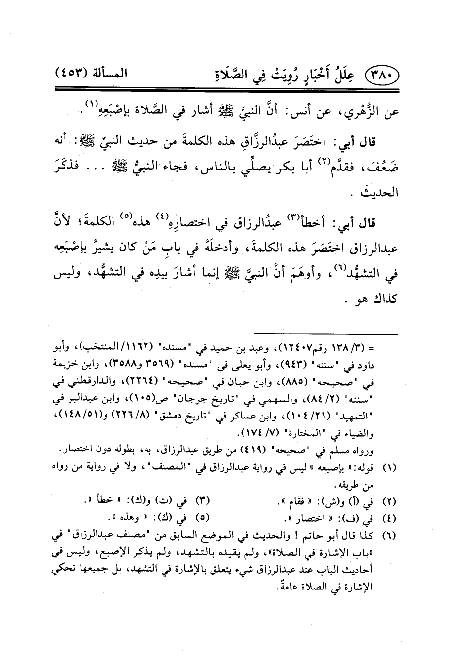 قَالَ أَبِي: أَخْطَأَ (٣) عبدُالرزاق فِي اختصارِهِ (٤) هَذِهِ (٥) الكلمةَ؛ لأنَّ عبد الرزاق اختَصَرَ هَذِهِ الكلمةَ، وأدخلَهُ فِي بابِ مَنْ كَانَ يشيرُ بإصْبَعِه فِي التشهُّد (٦) ، وأوهَمَ أنَّ النبيَّ (ص) إِنَّمَا أشارَ بيدِه فِي التشهُّد، وليس كذاك هو.