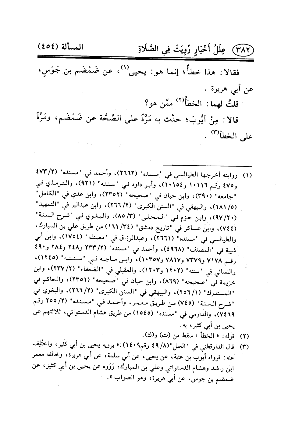 (٣) قال الدارقطني في "العلل" (٨/٤٩ رقم١٤٠٩) : «يرويه يحيى بن أبي كثير، واختُلِف عنه: فرواه أَيُّوبَ بْنِ عُتْبَةَ، عَنْ يَحْيَى، عَنْ أَبِي سَلَمَةَ، عَنْ أَبِي هريرة، وخالفه معمر بن راشد وهشام الدستوائي وعلي بن المبارك؛ رَوَوه عَنْ يَحْيَى بْنِ أَبِي كَثِيرٍ، عَنْ ضَمْضَمْ بْنِ جَوْسٍ، عَنْ أبي هريرة، وهو الصواب» .