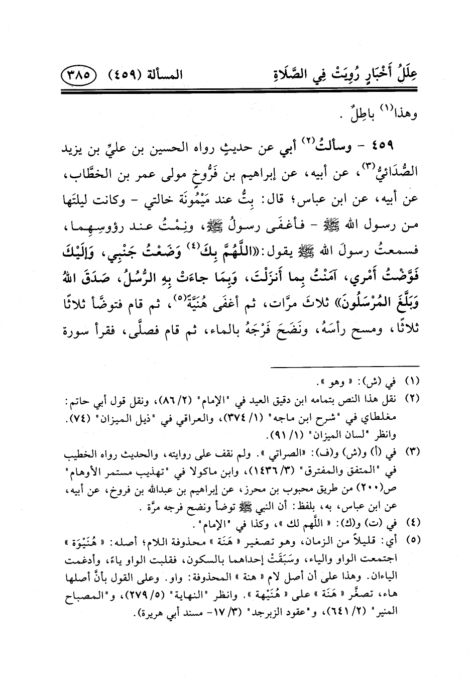 ٤٥٩ - وسألتُ (٢) أَبِي عَنْ حديثٍ رَوَاهُ الْحُسَيْنُ بْنُ عليِّ بْنِ يَزِيدَ الصُّدَائيُّ (٣) ، عَنْ أَبِيهِ، عَنْ إِبْرَاهِيمَ بْنِ فَرُّوخٍ مَوْلَى عُمَرَ بْنِ الخطَّاب، عَنْ أَبِيهِ، عَنِ ابْنِ عَبَّاسٍ؛ قَالَ: بِتُّ عِنْدَ مَيْمُونَة خَالَتِي - وَكَانَتْ ليلتَها من رسول الله (ص) - فأغفَى رسولُ (ص) ، ونِمْتُ عند رؤوسِهِما، فسمعتُ رسولَ الله (ص) يَقُولُ: اللَّهُمَّ بِكَ (٤) وَضَعْتُ جَنْبِي، وَإلَيْكَ فَوَّضْتُ أَمْري، آمَنْتُ بِما أَنزَلْتَ، وَبِمَا جاءَتْ بِهِ الرُّسُلُ، صَدَقَ اللهُ وَبَلَّغَ المُرْسَلُونَ ثلاثَ مرَّات، ثُمَّ أغفَى هُنَيَّةً (٥) ،