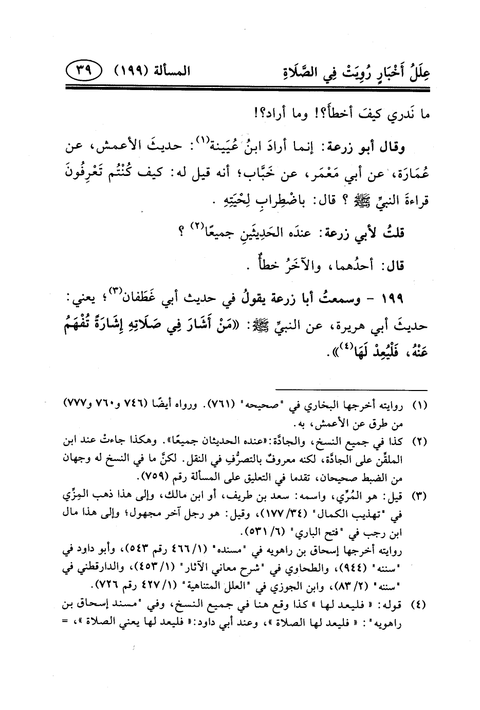 ١٩٩ - وسمعتُ أبا زرعة يقول ُ فِي حَدِيثِ أَبِي غَطَفان (٣) ؛ يَعْنِي: حديثَ أَبِي هُرَيْرَةَ، عَنِ النبيِّ (ص) : مَنْ أَشَارَ فِي صَلَاتِهِ إِشَارَةً تُفْهَمُ عَنْهُ، فَلْيُعِدْ لَهَا (٤) .