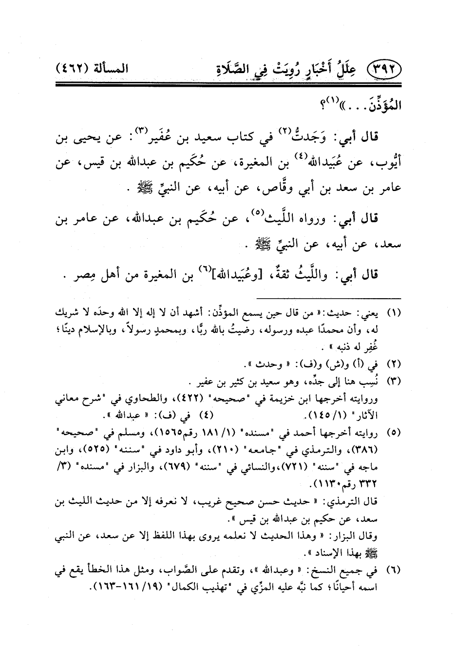 قَالَ أَبِي: وَرَوَاهُ اللَّيث (٥) ، عَنْ حُكَيم بن عبد الله، عَنْ عَامِرِ بْنِ سَعْدٍ، عَنِ أبيه، عن النبيِّ (ص) .