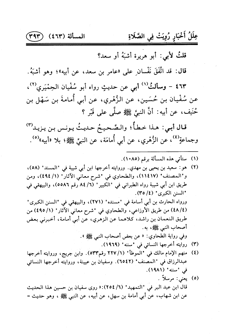 ٤٦٣ - وسألتُ (١) أَبِي عَنْ حديثٍ رَوَاهُ أَبُو سُفْيان الحِمْيَري (٢) ، عَنْ سُفْيان بْن حُسَين، عَنِ الزُّهْري، عَنْ أَبِي أُمامةَ بْن سَهْل بْن حُنَيف، عَنْ أبيه: أنَّ النبيَّ (ص) صلَّى عَلَى قَبْر؟