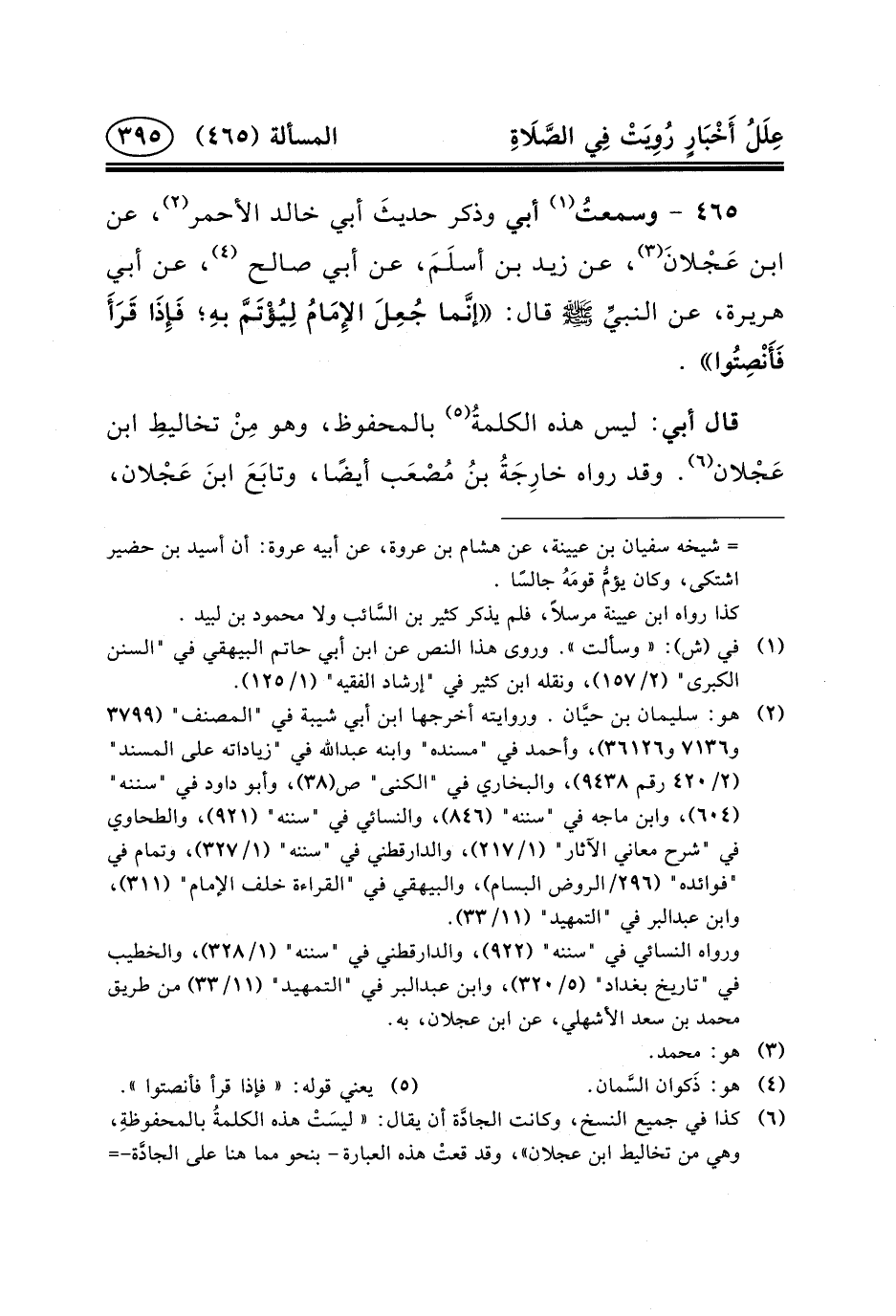 ٤٦٥ - وسمعتُ (١) أَبِي وَذَكَرَ حديثَ أَبِي خَالِدٍ الأَحْمَرِ (٢) ، عَنِ ابْنِ عَجْلانَ (٣) ، عن زيد ابن أسلَمَ، عَنْ أَبِي صَالِحٍ (٤) ، عَنْ أبي هريرة، عن النبيِّ (ص) قَالَ: إنَّما جُعِلَ الإِمَامُ لِيُؤْتَمَّ بهِ؛ فَإِذَا قَرَأَ فَأَنْصِتُوا.