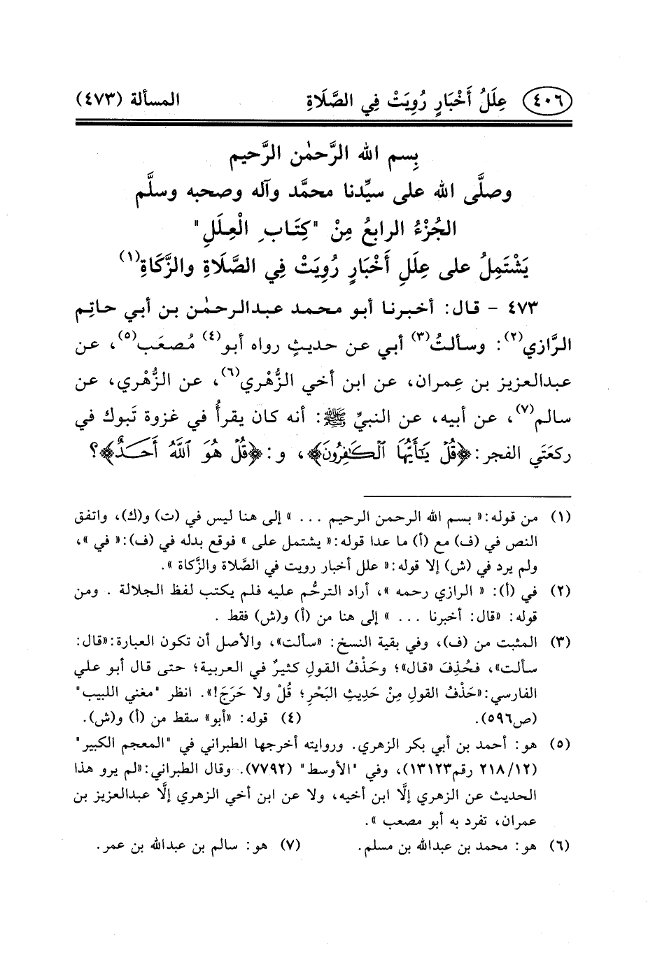 ٤٧٣ - قال: أخبرنا أبو محمد عبد الرحمن ابن أبي حاتِم الرَّازي (٢) : وسألتُ (٣) أَبِي عَنْ حديثٍ رواه أبو (٤) مُصعَب (٥) ، عن عبد العزيز ابن عِمران، عَنِ ابْنِ أخي الزُّهْري (٦) ، عَنِ الزُّهْري، عَنْ سَالِمٍ (٧) ، عَنْ أبيه، عن النبيِّ (ص) : أَنَّهُ كَانَ يقرأُ فِي غزوة تَبوك فِي ركعَتَي الفجر: {قُلْ يَاأَيُّهَا الْكَافِرُونَ *} ، و: {} ؟