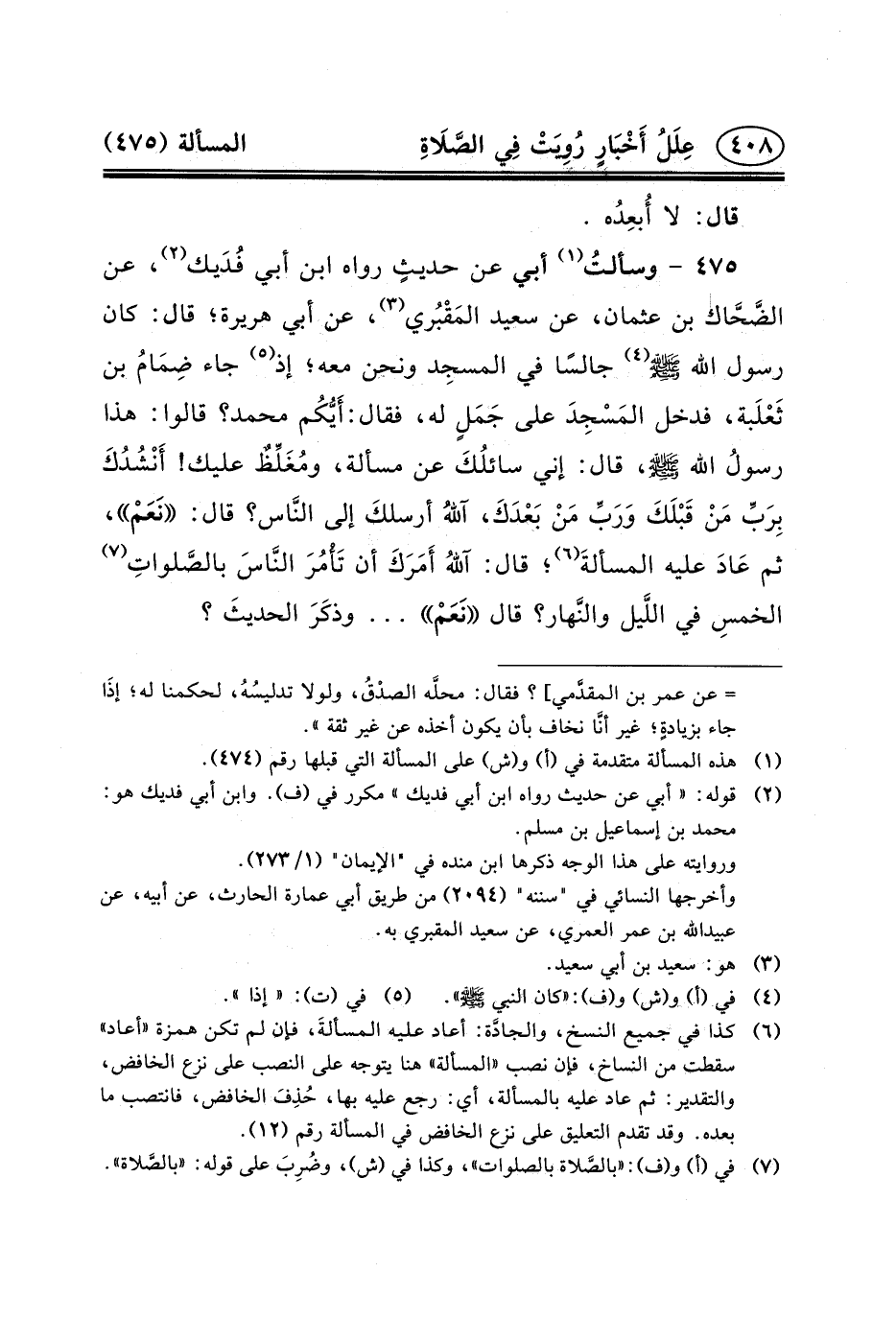 عَنِ الضَّحَّاك بْنِ عُثْمَانَ، عَنْ سَعِيدٍ المَقْبُري (٣) ، عَنْ أَبِي هُرَيْرَةَ؛ قَالَ: كَانَ رَسُولُ اللَّهِ (ص) (٤) جَالِسًا فِي المسجِد وَنَحْنُ مَعَهُ؛ إِذْ (٥) جَاءَ ضِمَامُ بْنُ ثَعْلَبة، فَدَخَلَ المَسْجِدَ عَلَى جَمَلٍ لَهُ، فَقَالَ: أَيُّكُم مُحَمَّدٌ؟ قَالُوا: هَذَا رسولُ الله (ص) ، قَالَ: إِنِّي سائلُكَ عَنْ مَسْأَلَةٍ، ومُغَلِّظٌ عَلَيْكَ! أَنْشُدُكَ بِرَبِّ مَنْ قَبْلَكَ وَرَبِّ مَنْ بَعْدَكَ، آللهُ أرسلكَ إِلَى النَّاس؟ قَالَ: نَعَمْ، ثُمَّ عَادَ عَلَيْهِ المسألةَ (٦) ؛ قَالَ: آللهُ أَمَرَكَ أَنْ تَأْمُرَ النَّاسَ بالصَّلواتِ (٧) الخمسِ في اللَّيل والنَّهار؟ قَالَ نَعَمْ ... وذكَرَ الحديثَ؟