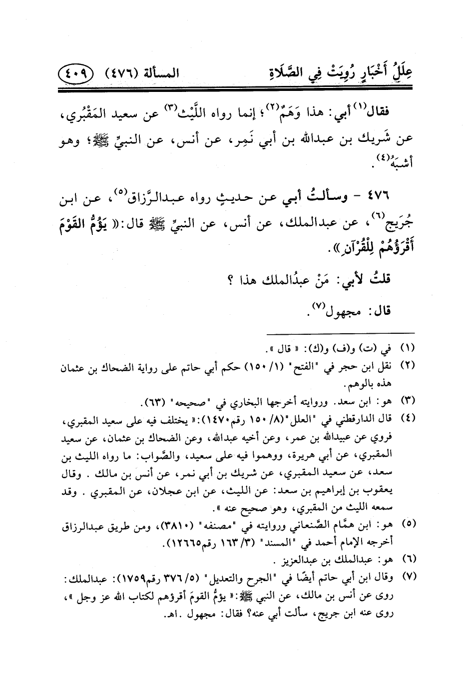 ٤٧٦ - وسألتُ أَبِي عَنْ حديثٍ رواه عبد الرَّزاق (٥) ، عن ابن جُرَيج (٦) ، عن عبد الملك، عن أنس، عن النبيِّ (ص) قَالَ: يَؤُمُّ القَوْمَ أَقْرَؤُهُمْ لِلْقُرْآن ِ.
