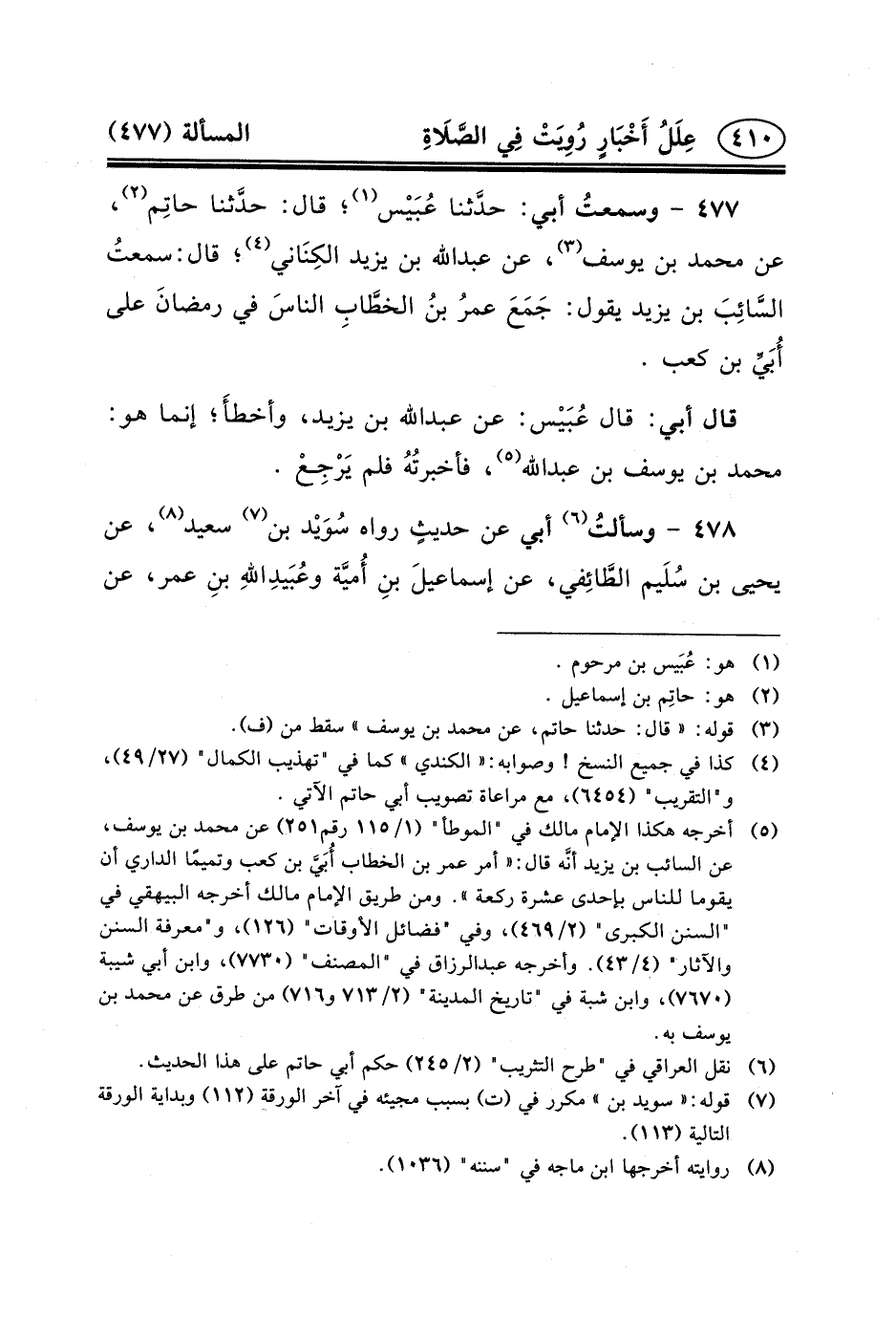 ٤٧٧ - وسمعتُ أَبِي: حدَّثنا عُبَيْس (١) ؛ قَالَ: حدَّثنا حاتِم (٢) ، عَنْ مُحَمَّدِ بْنِ يوسف (٣) ، عن عبد الله بْنِ يَزِيدَ الكِنَاني (٤) ؛ قَالَ: سمعتُ السَّائِبَ بْن يَزِيدَ يَقُولُ: جَمَعَ عمرُ ابنُ الخطَّابِ الناسَ فِي رمضانَ عَلَى أُبَيِّ بْن كعب.