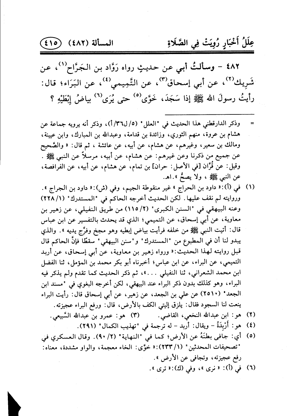 ٤٨٢ - وسألتُ أَبِي عَنْ حديثٍ رَوَاهُ رَوَّاد ابن الجَرَّاح (١) ، عَنْ شَرِيك (٢) ، عَنْ أَبِي إِسْحَاقَ (٣) ، عَنِ التَّمِيمي (٤) ، عَنِ البَرَاء؛ قال: رأيتُ رسولَ الله (ص) إِذَا سَجَدَ، خَوَّى (٥) حَتَّى يُرَى (٦) بياضُ إِبْطَيْهِ؟