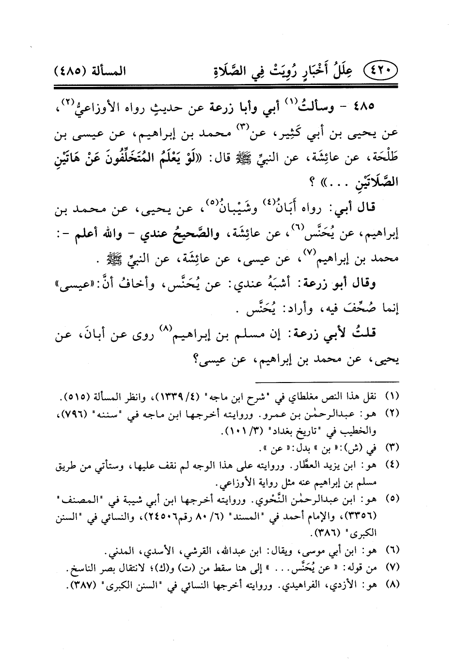 ٤٨٥ - وسألتُ (١) أَبِي وَأَبَا زُرْعَةَ عَنْ حديثٍ رَوَاهُ الأوزاعيُّ (٢) ، عَنْ يَحْيَى بْنِ أَبِي كَثِير، عَنْ (٣) مُحَمَّدِ بْنُ إِبْرَاهِيمَ، عَنْ عِيسَى بْنِ طَلْحَة، عَنْ عائِشَة، عَنِ النبيِّ (ص) قَالَ: لَوْ يَعْلَمُ المُتَخَلِّفُونَ عَنْ هَاتَيْنِ الصَّلَاتَيْنِ ... ؟