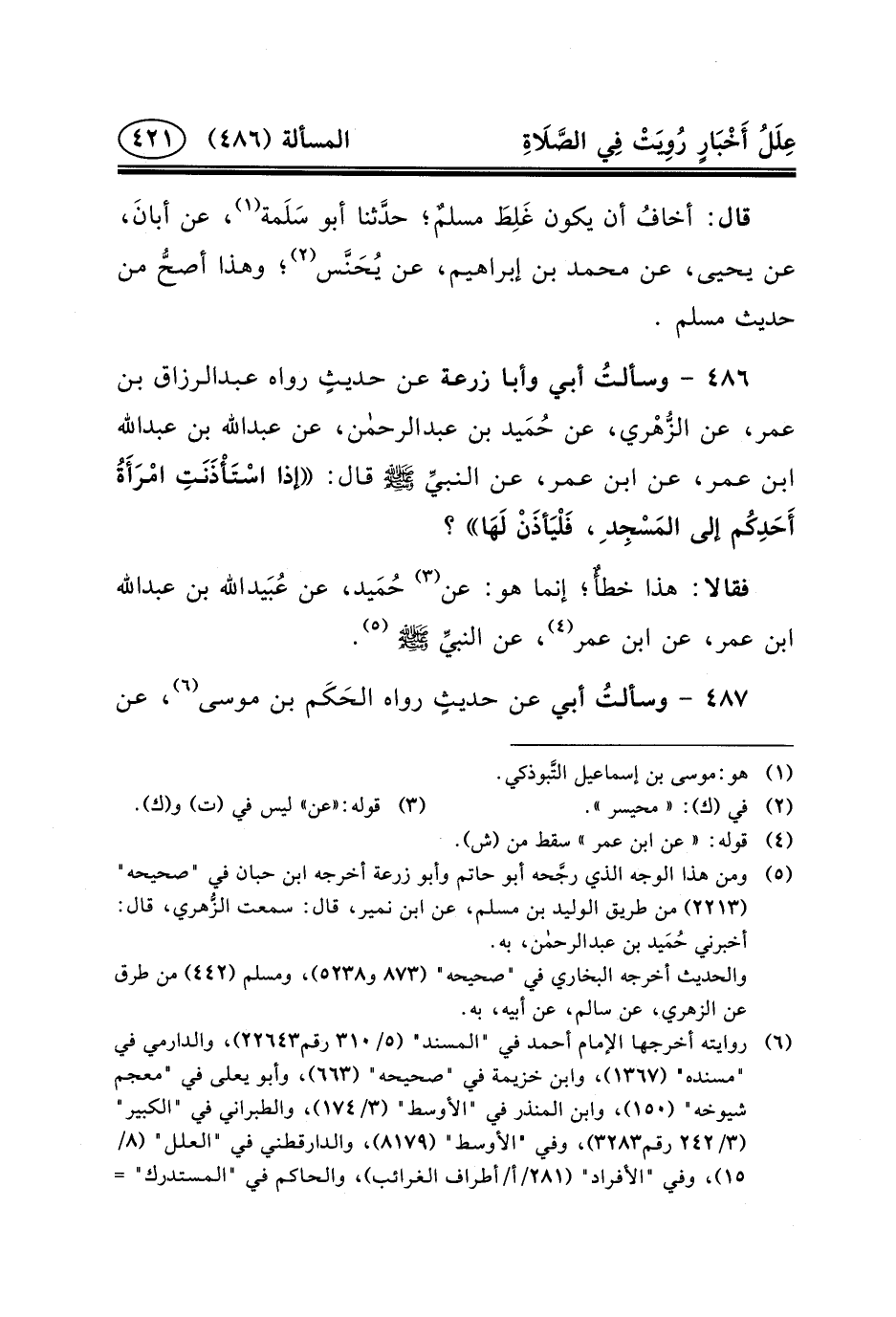 فَقَالا: هَذَا خطأٌ؛ إِنَّمَا هُوَ: عَنْ (٣) حُمَيد، عَنْ عُبَيدالله بن عبد الله بْنِ عُمَرَ، عَنِ ابْنِ عُمَرَ (٤) ، عن النبيِّ (ص) (٥) .