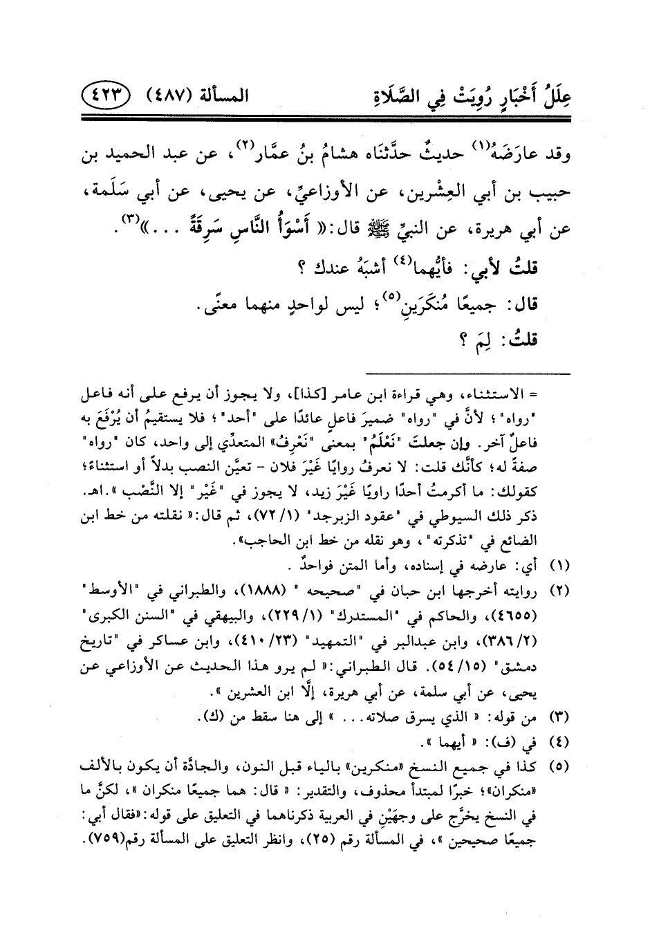 (٦) كذا في جميع النسخ «منكرين» بالياء قبل النون، والجادَّة أن يكون بالألف «منكران» ؛ خبرًا لمبتدأ محذوف، والتقدير: «قال: هما جميعًا منكران» ، لكنَّ ما في النسخ يخرَّج على وجهَيْنِ في العربية ذكرناهما في التعليق على قوله: «فقال أبي: جميعًا صحيحين» ، في المسألة رقم (٢٥) ، وانظر التعليق على المسألة رقم (٧٥٩) .