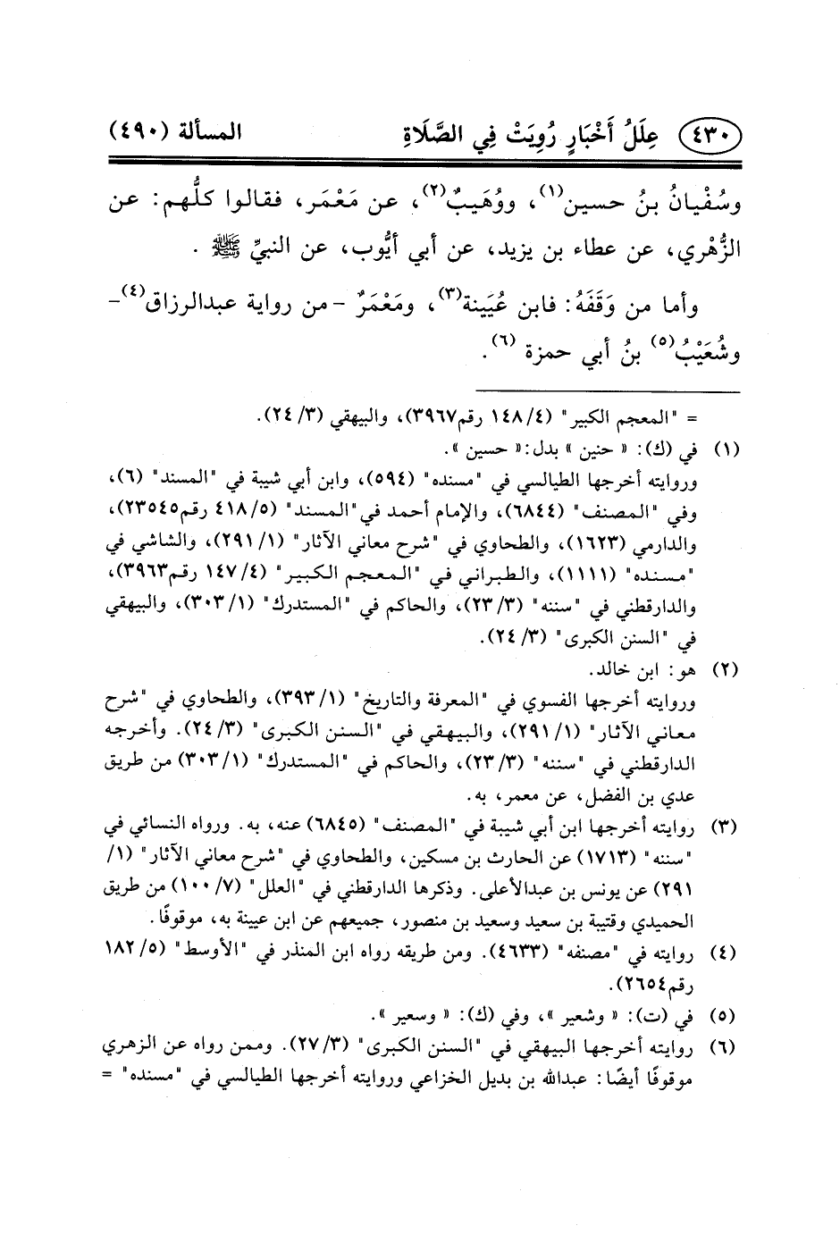 (٣) روايته أخرجها ابن أبي شيبة في "المصنف" (٦٨٤٥) عنه، به. ورواه النسائي في "سننه" (١٧١٣) عن الحارث بن مسكين، والطحاوي في "شرح معاني الآثار" (١/٢٩١) عن يونس بن عبد الأعلى. وذكرها الدارقطني في "العلل" (٧/١٠٠) من طريق الحميدي وقتيبة بن سعيد وسعيد بن منصور، جميعهم عن ابن عيينة به، موقوفًا.