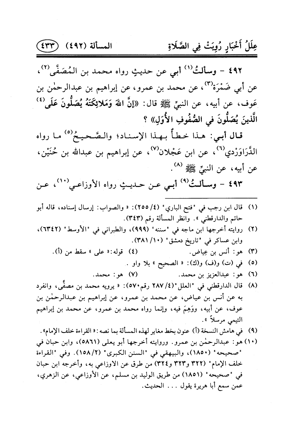 ٤٩٢ - وسألتُ (١) أَبِي عَنْ حديثٍ رَوَاهُ مُحَمَّدُ بْنُ المُصَفَّى (٢) ، عَنْ أَبِي ضَمْرَة (٣) ، عَنْ مُحَمَّدِ بْنِ عَمْرٍو، عن إبراهيم بن عبد الرحمن ابن عَوف، عَنْ أَبِيهِ، عَنِ النبيِّ (ص) قَالَ: إنَّ اللهَ وَمَلائِكَتَهُ يُصَلُّونَ عَلَى (٤) الَّذينَ يُصَلُّونَ فِي الصُّفُوفِ الأُوَلِ؟