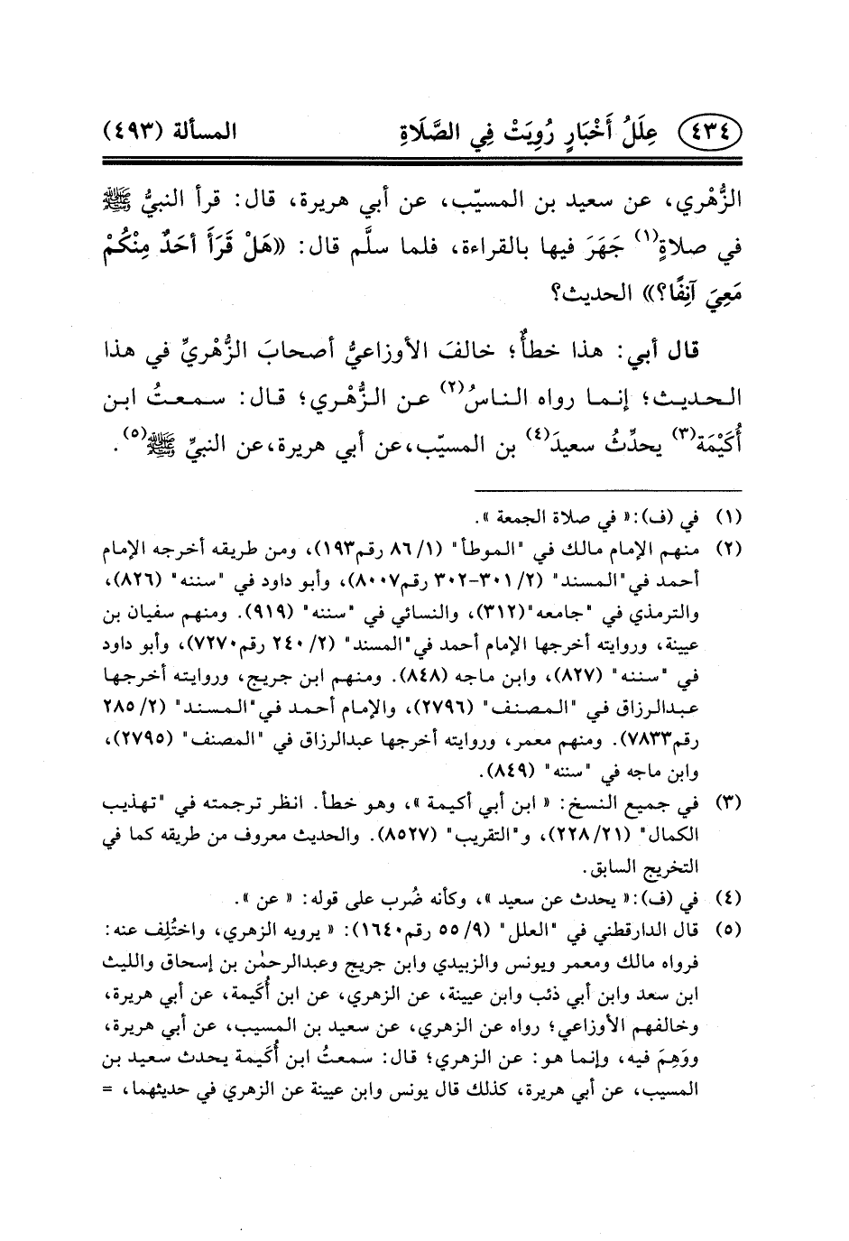 وقال ابن عبد البر في "التمهيد" (١١/٢٤) : «لم يختلف رواة "الموطأ" فيما علمت في هذا الحديث من أوله إلى آخره، وزاد فيه: روح بن عبادة عن مَالِكٌ عَنِ ابْنِ شِهَابٍ أَنَّهُ قال: لا قراءة خلف الإمام فيما يجهر فيه الإمام. وقد رَوَاهُ بَعْضُ أَصْحَابِ الأَوْزَاعِيِّ، عَنِ الأَوْزَاعِيُّ، عَنِ الزُّهْرِيِّ، عَنْ سَعِيدِ بْنِ الْمُسَيِّبِ، عَنْ أَبِي هُرَيْرَةَ، عن النبي (ص) جعل في موضع ابن أكيمة: سعيد بن المسيب، وذلك وهم وغلط عند جميع أهل العلم بالحديث، والحديث محفوظ لابن أكيمة. وإنما دخل الوهم فيه عليه لأن ابن شهاب كان يقول في هذا الحديث: سمعت ابن أكيمة يحدث عَنْ سَعِيدِ بْنِ الْمُسَيَّبِ، عَنْ أبي هريرة، فتوهم أنه لابن شِهَابٍ، عَنْ سَعِيدِ بْنِ الْمُسَيِّبِ، عن أبي هريرة. ولا يختلف أهل العلم بالحديث: أن هذا الحديث لابن شهاب عن ابن أكيمة، عن أبي هريرة. وأن ذكر سعيد بن المسيب في إسناد هذا الحديث خطأ لا شك عندهم فيه، وإنما ذلك عندهم؛ لأنه كان في مجلس سعيد بن المسيب، فهذا وجه ذكر سعيد بن المسيب لا أنه في الإسناد» . اهـ.