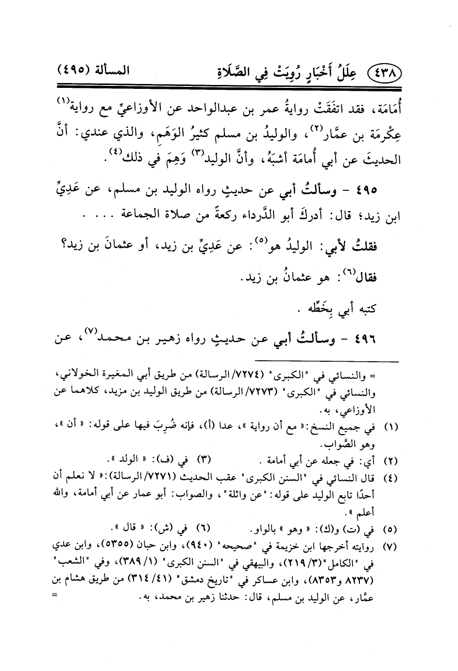 ٤٩٥ - وسألتُ أَبِي عَنْ حديثٍ رَوَاهُ الوليد ابن مسلم، عَن عَدِيِّ بْن زَيْدٍ؛ قَالَ: أدركَ أَبُو الدَّرداء ركعة من صلاة الجماعة ... .