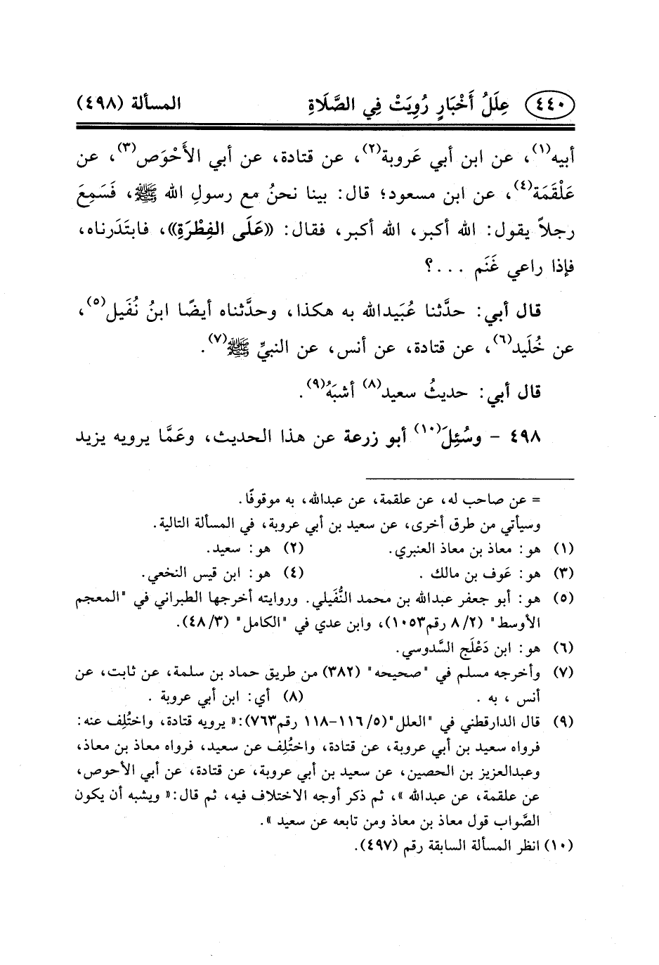 (٩) قال الدارقطني في "العلل" (٥/١١٦-١١٨ رقم٧٦٣) : «يرويه قتادة، واختُلِف عنه: فرواه سَعِيدِ بْنِ أَبِي عَرُوبَةَ، عَنْ قتادة، واختُلِف عن سعيد، فرواه معاذ بن معاذ، وعبد العزيز بن الحصين، عَنْ سَعِيدِ بْنِ أَبِي عَرُوبَةَ، عَنْ قَتَادَةَ، عَنْ أَبِي الأَحْوَصِ، عن علقمة، عن عبد الله» ، ثم ذكر أوجه الاختلاف فيه، ثم قال: «ويشبه أن يكون الصَّواب قول معاذ بن معاذ ومن تابعه عن سعيد» .