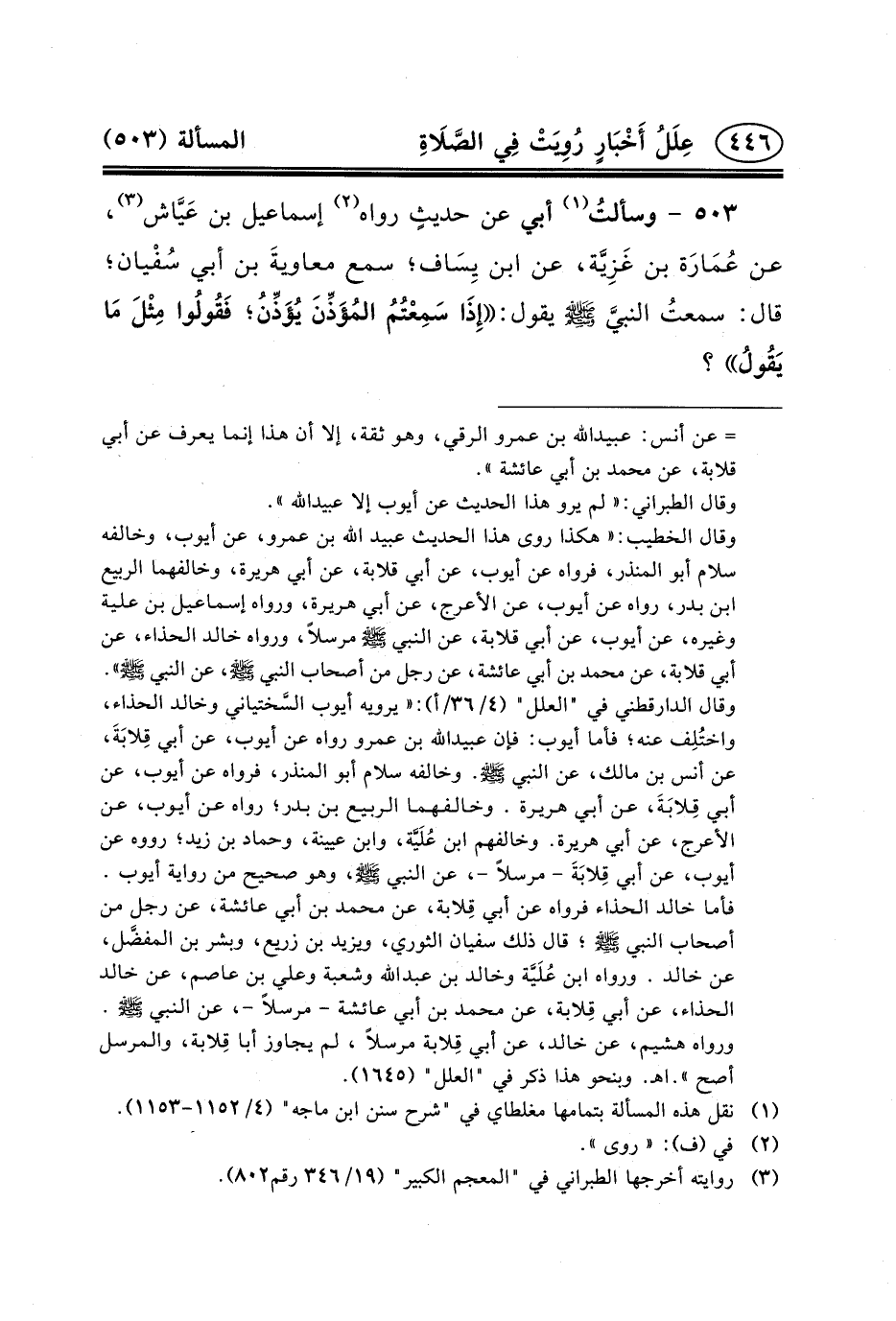 ٥٠٣ - وسألتُ (١) أَبِي عَنْ حديثٍ رَوَاهُ (٢) إِسْمَاعِيلُ بْنُ عَيَّاش (٣) ، عَنْ عُمَارَة بْنِ غَزِيَّة، عَنِ ابْنِ يِسَاف؛ سَمِعَ معاويةَ بْنَ أَبِي سُفْيان؛ قال: سمعتُ النبيَّ (ص) يقول: إِذَا سَمِعْتُمُ المُؤَذِّنَ يُؤَذِّنُ؛ فَقُولُوا مِثْلَ مَا يَقُولُ؟
