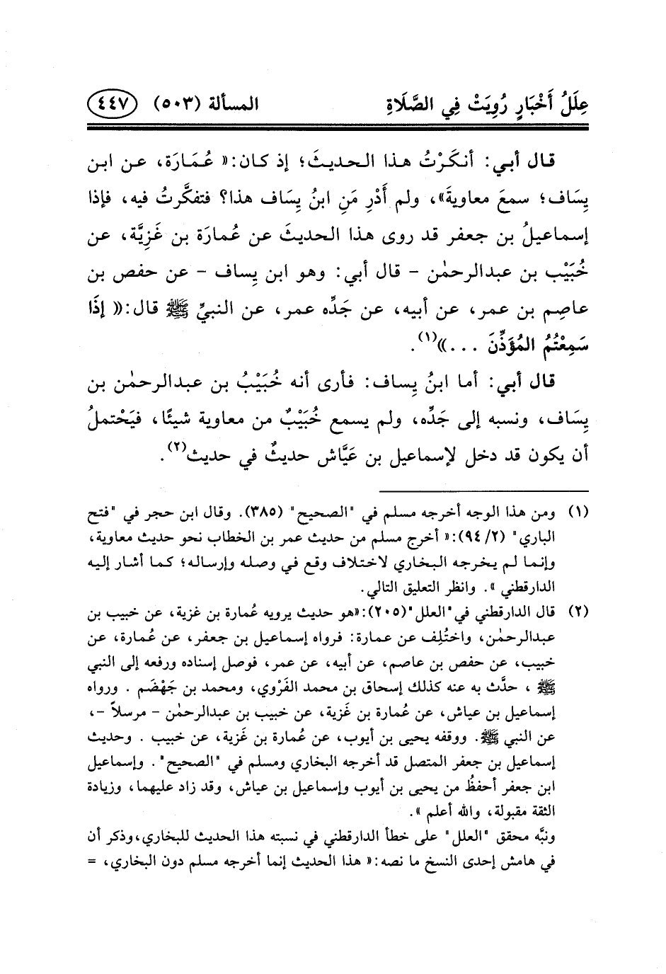 (٢) قال الدارقطني في"العلل" (٢٠٥) : «هو حديث يرويه عُمارة بْنِ غَزِيَّةَ، عَنَ خُبَيْبِ بن عبد الرحمن، واختُلِف عن عمارة: فرواه إسماعيل بن جعفر، عن عُمارة، عَنْ خُبَيْبٍ، عَنْ حَفْصِ بْنِ عَاصِمٍ، عَنْ أَبِيهِ، عَن عُمَر، فوصل إسناده ورفعه إلى النبي (ص) ، حدَّث به عنه كذلك إسحاق بن محمد الفَرْوي، ومحمد بن جَهْضَم. ورواه إِسْمَاعِيلُ بْنُ عَيَّاشٍ، عَنْ عُمارة بْنِ غَزية، عَنَ خُبَيْبِ بْنِ عبد الرحمن - مرسلاً -، عن النبي (ص) . ووقفه يحيى بن أيوب، عَنْ عُمارة بْنِ غَزية، عَنِ خبيب. وحديث إسماعيل بن جعفر المتصل قد أخرجه البخاري ومسلم في "الصحيح". وإسماعيل ابن جعفر أحفظُ من يحيى بن أيوب وإسماعيل بن عياش، وقد زاد عليهما، وزيادة الثقة مقبولة، والله أعلم» .
