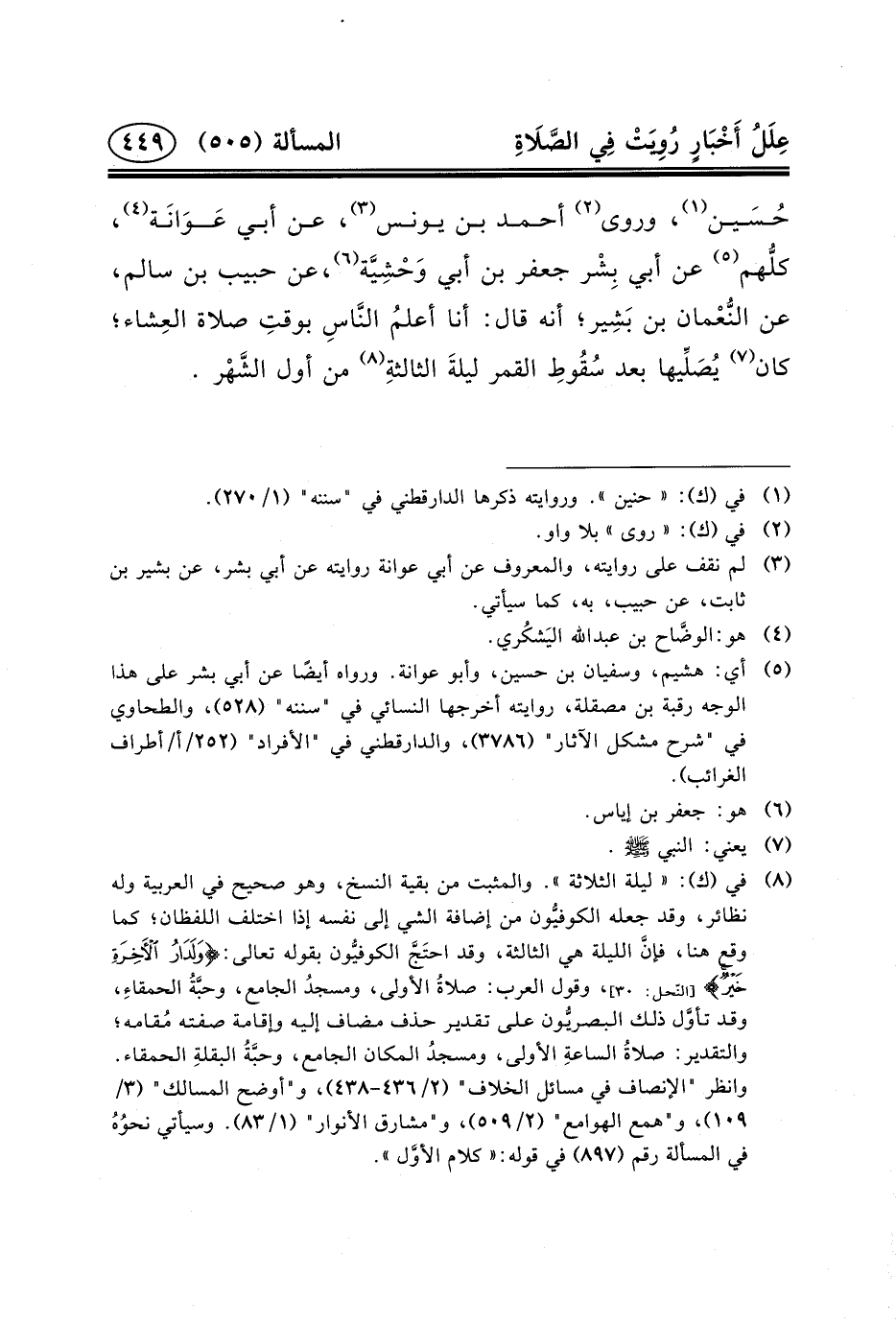 حُسَين (١) ، وروى (٢) أَحْمَد بْن يُونُسَ (٣) ، عَنْ أَبِي عَوَانَة (٤) ، كلُّهم (٥) عَنْ أَبِي بِشْر جَعْفَر بْن أَبِي وَحْشِيَّة (٦) ، عَنْ حَبِيبِ بْنِ سالِم، عَنِ النُّعْمان بْنِ بَشِير؛ أَنَّهُ قَالَ: أَنَا أعلمُ النَّاسِ بوقتِ صلاة العِشاء؛ كَانَ (٧) يُصَلِّيها بعد سُقُوطِ القمر ليلةَ الثالثةِ (٨)