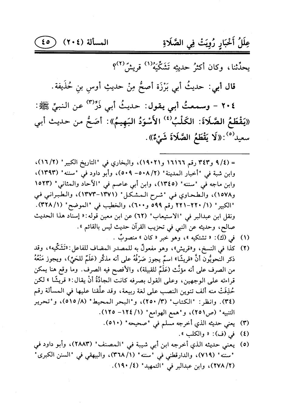 ٢٠٤ - وسمعتُ أَبِي يَقُولُ: حديثُ أَبِي ذَرٍّ (٣) عَنِ النبيِّ (ص) : يَقْطَعُ الصَّلَاةَ: الكَلْبُ (٤) الأَسْوَدُ البَهِيمُ: أصَحُّ من حَدِيث أَبِي سَعِيد (٥) : لَا يَقْطَعُ الصَّلَاةَ شَيْءٌ.