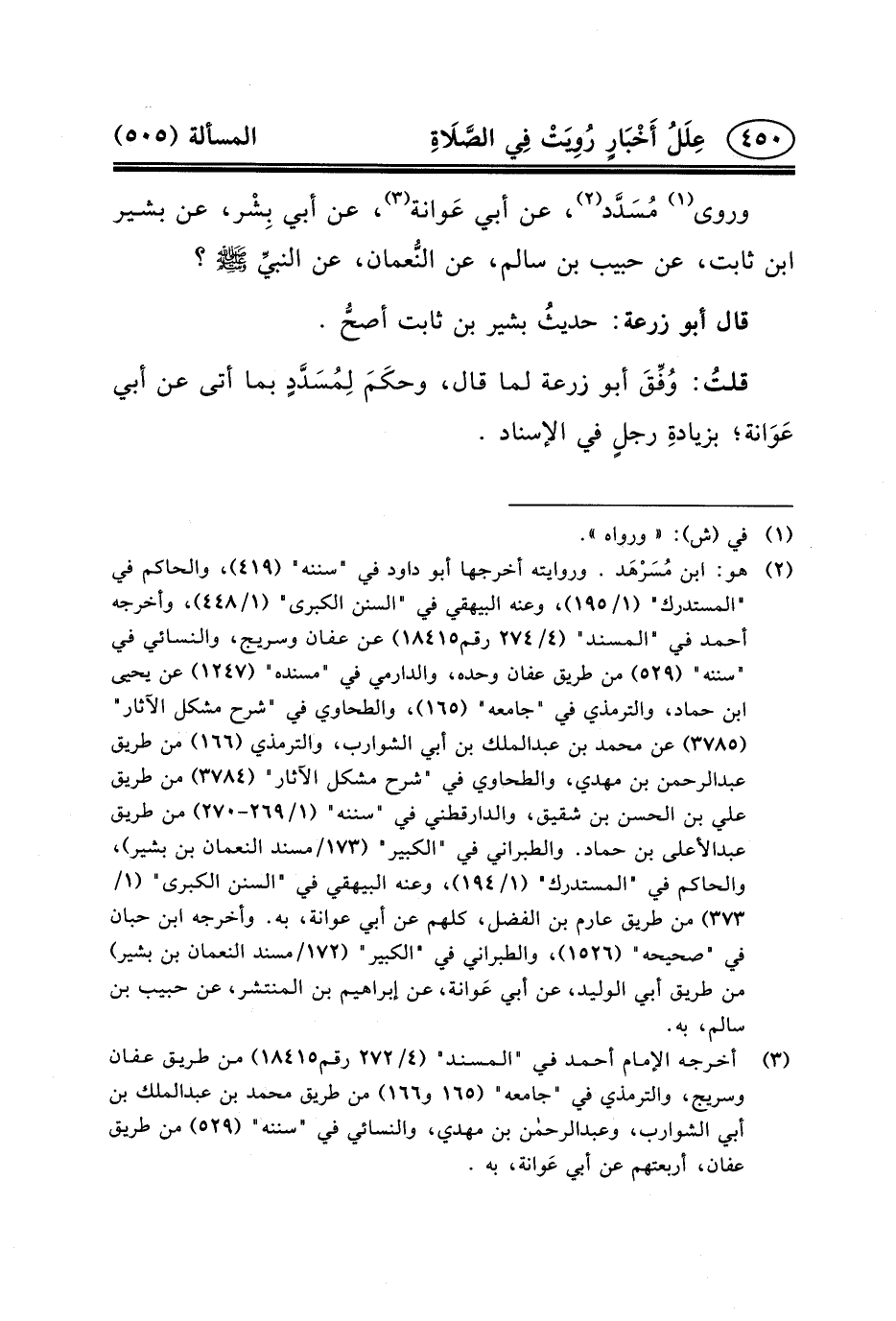وروى (١) مُسَدَّد (٢) ، عَنْ أَبِي عَوانة (٣) ، عَنْ أَبِي بِشْر، عَن بشير بن ثابت، عن حبيب ابن سالِم، عَنِ النُّعمان، عَنِ النبيِّ (ص) ؟