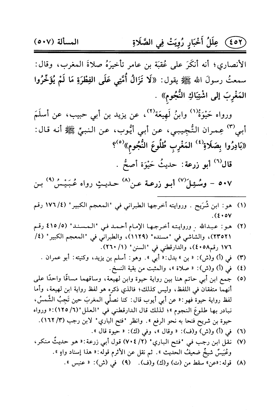 وَرَوَاهُ حَيْوَةُ (١) وابنُ لَهِيعَة (٢) ، عَنْ يَزِيدَ بْنِ أَبِي حَبِيبٍ، عَنْ أسلَمَ أَبِي (٣) عِمران التُّجِيبي، عَنْ أَبِي أيُّوب، عن النبيِّ (ص) أَنَّهُ قَالَ: بَادِرُوا بِصَلَاةِ (٤) المَغْرِبِ طُلُوعَ النُّجُومِ (٥) ؟