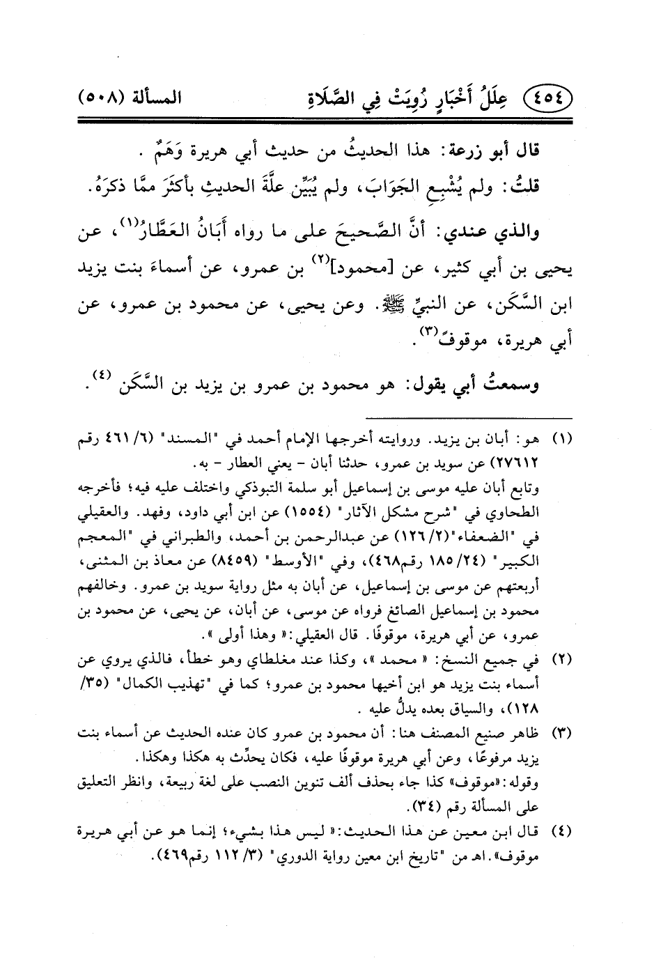 عَنْ يَحْيَى بْنِ أَبِي كَثِيرٍ، عَنْ [مَحْمُودِ] (٢) بْنِ عَمْرٍو، عَنْ أسماءَ بنت يزيد ابن السَّكَن، عن النبيِّ (ص) . وَعَنْ يَحْيَى، عَنْ مَحْمُودِ بْنِ عَمْرٍو، عَنْ أَبِي هُرَيْرَةَ، مَوْقُوفٌ (٣) .