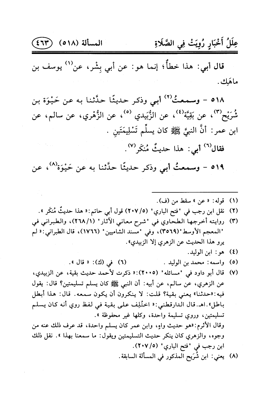 ٥١٨ - وسمعتُ (٢) أَبِي وَذَكَرَ حَدِيثًا حدَّثنا بِهِ عَنْ حَيْوَة بْنِ شُرَيْح (٣) ، عَنْ بَقِيَّة (٤) ، عَنِ الزُّبَيدي (٥) ، عَنِ الزُّهْري، عَنْ سَالِمٍ، عَنِ ابْنِ عُمَرَ: أنَّ النبيَّ (ص) كَانَ يسلِّم تَسْلِيمَتَينِ.
