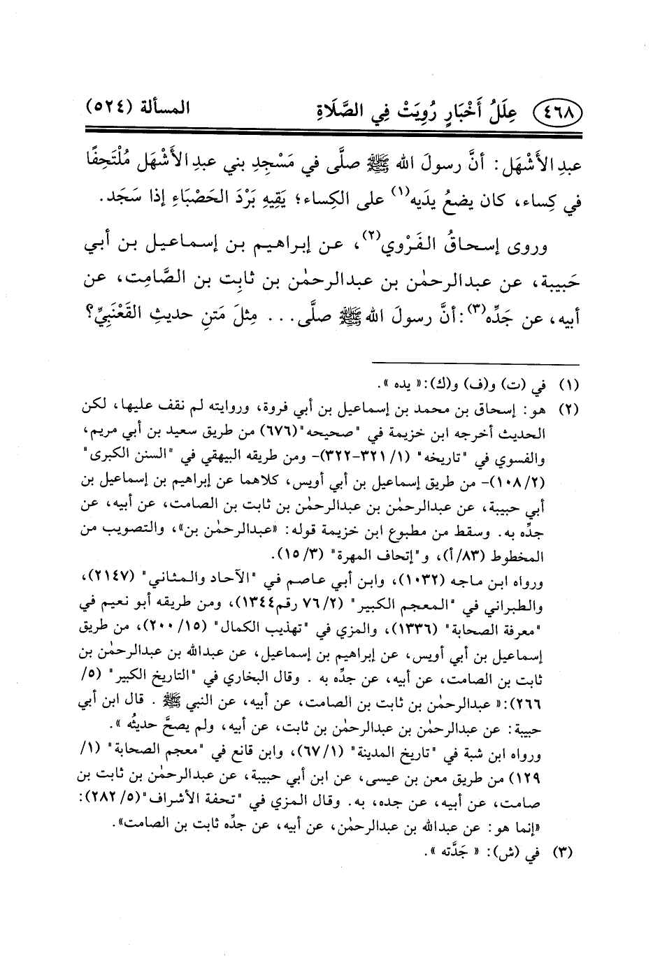 عَنْ إِبْرَاهِيمَ بْنِ إِسْمَاعِيلَ بْنِ أبي حَبيبة، عن عبد الرحمن بن عبد الرحمن بْنِ ثابِت بْنِ الصَّامِت، عَنْ أَبِيهِ، عَنْ جَدِّه (٣) : أنَّ رسولَ الله (ص) صلَّى ... مِثلَ مَتنِ حديثِ القَعْنَبِيِّ؟