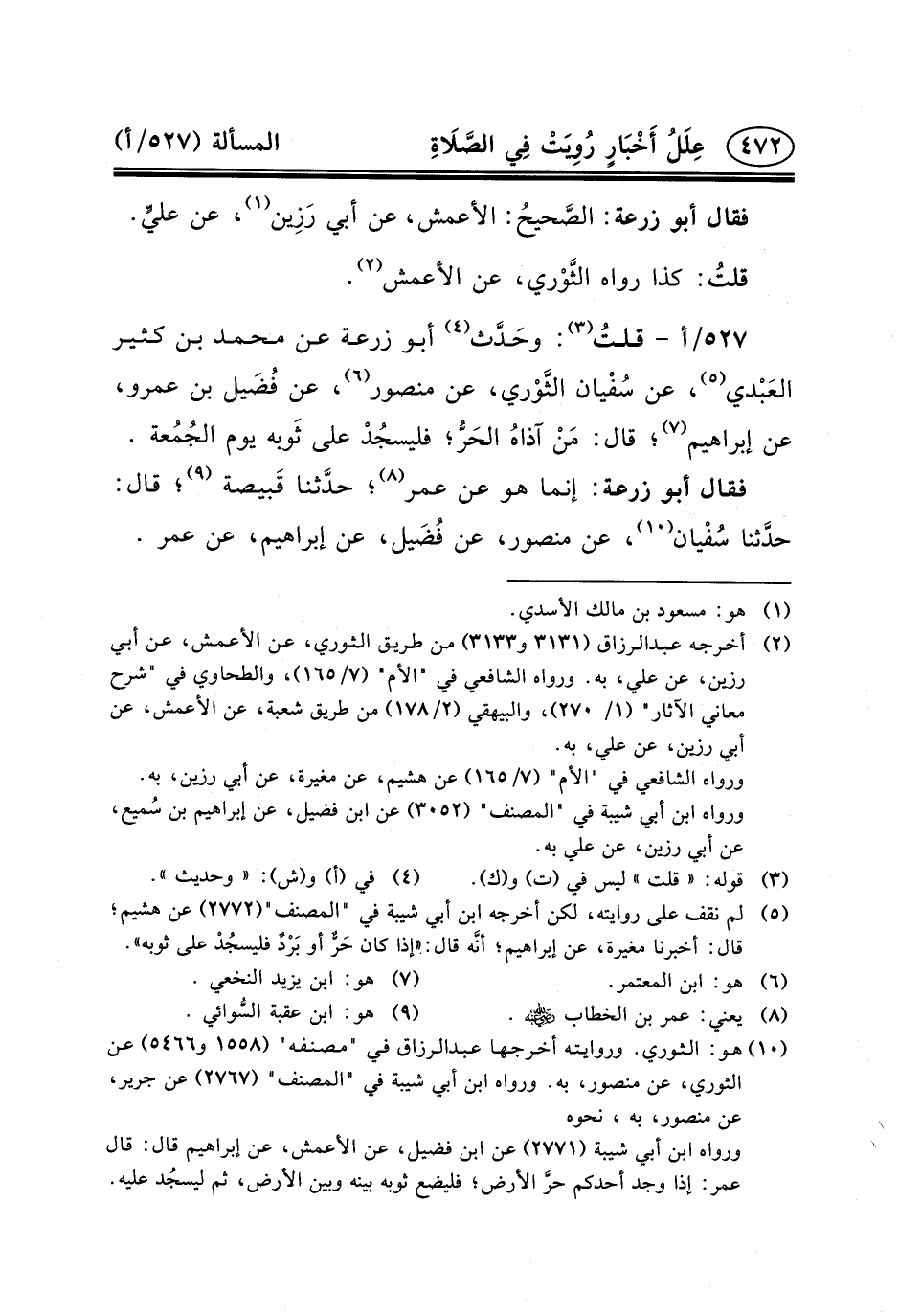 ٥٢٧/أ - قلتُ (٣) : وحَدَّث (٤) أَبُو زُرْعَةَ عَنْ مُحَمَّدِ بْنِ كثير العَبْدي (٥) ، عَنْ سُفْيان الثَّوْري، عَنْ مَنْصُورٍ (٦) ، عَن فُضَيل بْن عَمْرٍو، عَنْ إِبْرَاهِيمَ (٧) ؛ قَالَ: مَنْ آذاهُ الحَرُّ؛ فليسجُدْ عَلَى ثَوبه يوم الجُمُعة.