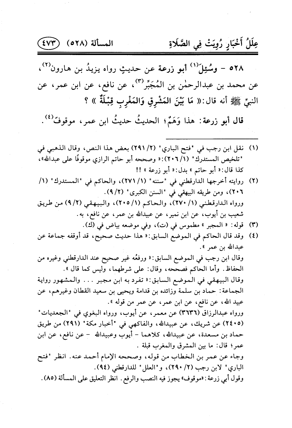 ٥٢٨ - وسُئِلَ (١) أَبُو زُرْعَةَ عَنْ حديثٍ رَوَاهُ يزيدُ بْنُ هَارُونَ (٢) ، عَنْ محمد بن عبد الرحمن بن المُجَبِّر (٣) ، عَنْ نَافِعٍ، عَنِ ابْنِ عُمَرَ، عن النبيِّ (ص) أَنَّهُ قَالَ: مَا بَيْنَ المَشْرِقِ وَالمَغْرِبِ قِبْلَةٌ؟