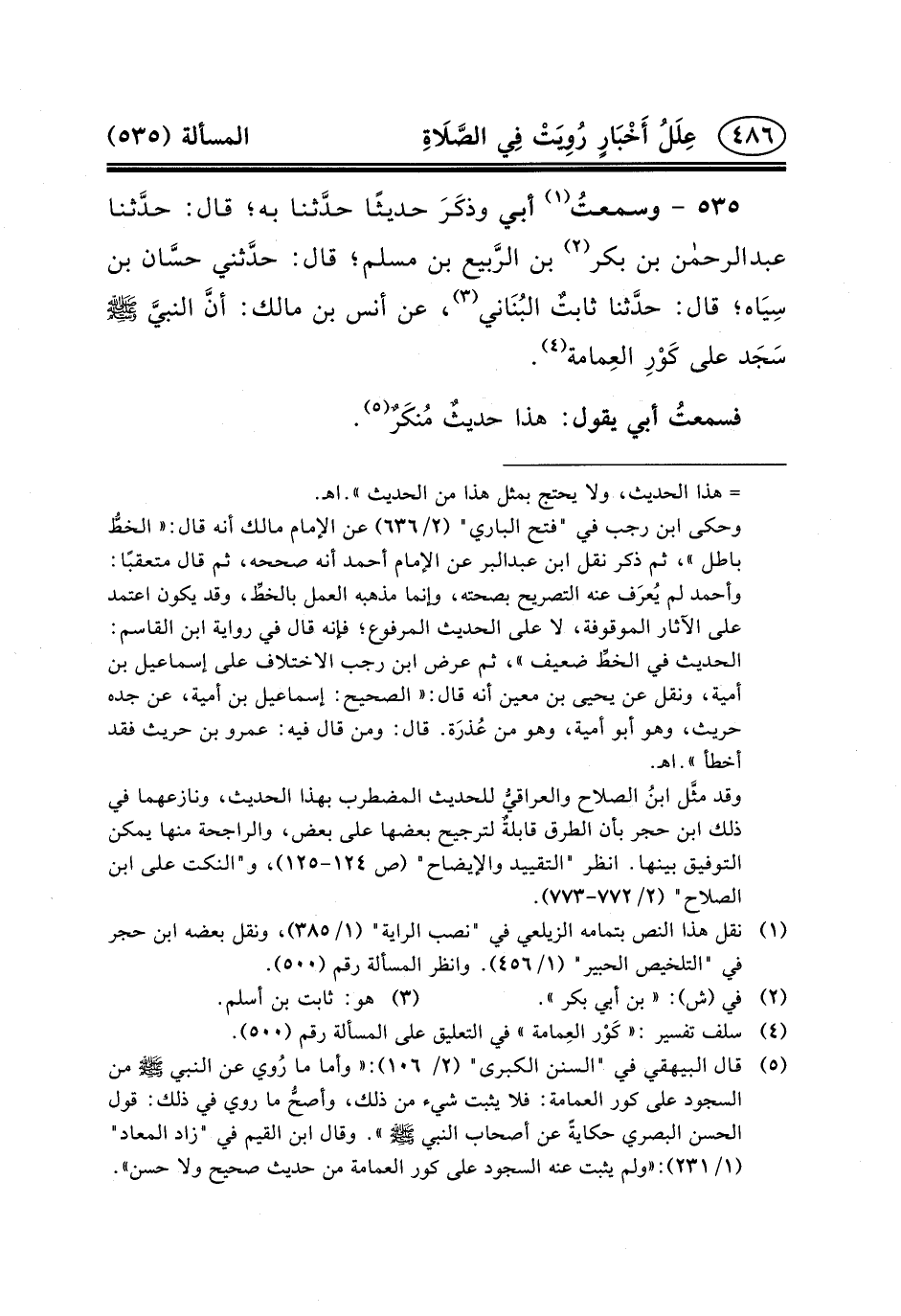 ٥٣٥ - وسمعتُ (١) أَبِي وذكَرَ حَدِيثًا حدَّثنا به؛ قال: حدَّثنا عبد الرحمن بْنُ بَكْرِ (٢) بْنِ الرَّبيع بْنِ مُسْلِمٍ؛ قَالَ: حدَّثني حسَّان بْنُ سِيَاه؛ قَالَ: حدَّثنا ثابتٌ البُنَاني (٣) ، عن أنس ابن مالك: أنَّ النبيَّ (ص) سَجَد عَلَى كَوْرِ العِمامة (٤) .