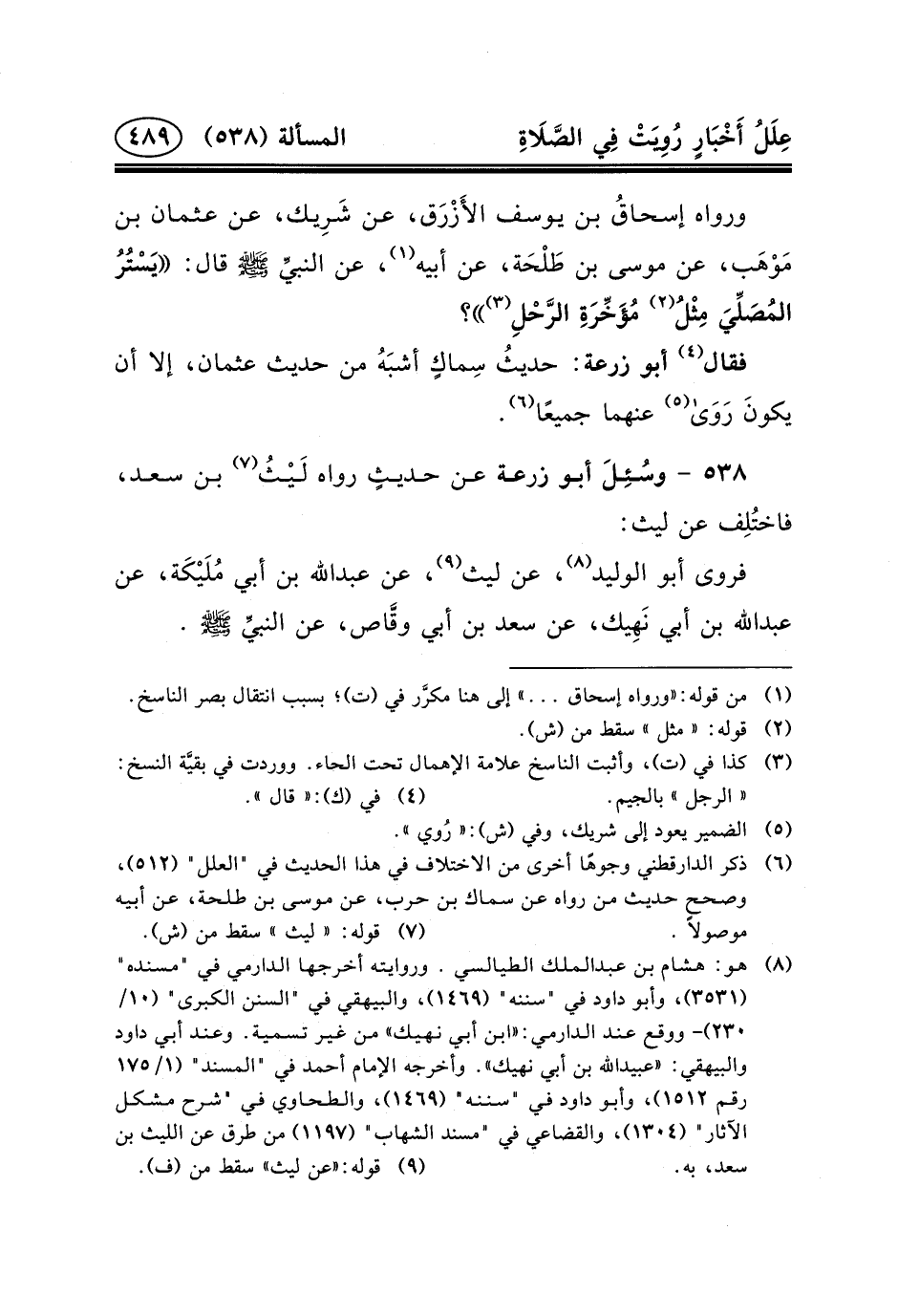 وَرَوَاهُ إسحاقُ بْنُ يُوسُفَ الأَزْرَق، عَنْ شَرِيك، عَنْ عُثْمَانَ بْنِ مَوْهَب، عَنْ مُوسَى بْنِ طَلْحَة، عن أبيه (١) ، عن النبيِّ (ص) قَالَ: يَسْتُرُ المُصَلِّيَ مِثْلُ (٢) مُؤَخِّرَةِ الرَّحْلِ (٣) ؟