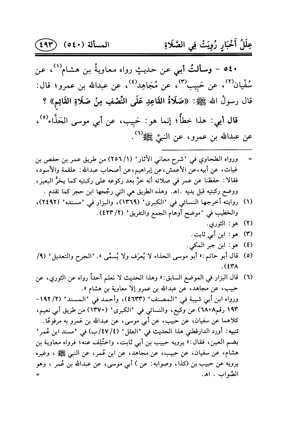 ٥٤٠ - وسألتُ أَبِي عَنْ حديثٍ رَوَاهُ معاويةُ بْنُ هِشَامٍ (١) ، عَنْ سُفْيان (٢) ، عَنْ حَبِيب (٣) ، عَنْ مُجَاهِد (٤) ، عَنْ عبد الله بْنِ عَمْرٍو؛ قَالَ: قَالَ رسولُ الله (ص) : صَلَاةُ القَاعِدِ عَلَى النِّصْفِ مِنْ صَلَاةِ القَائِمِ؟