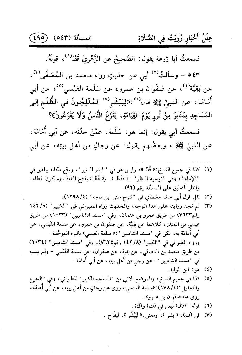 ٥٤٣ - وسألتُ (٢) أَبِي عَنْ حديثٍ رَوَاهُ مُحَمَّدُ بْنُ المُصَفَّى (٣) ، عَنْ بَقِيَّة (٤) ، عَنْ صَفْوان بْنِ عَمْرٍو، عَنْ سَلَمة القَيْسي (٥) ، عَنْ أَبِي أُمَامَة، عَنِ النبيِّ (ص) قَالَ (٦) : لِيَبْشُرِ (٧) المُدْلِجُونَ فِي الظُّلَمِ إِلَى المَسَاجِدِ بِمَنَابِرَ مِنْ نُورٍ يَوْمَ القِيَامَةِ، يَفْزَعُ النَّاسُ وَلَا يَفْزَعُونَ؟