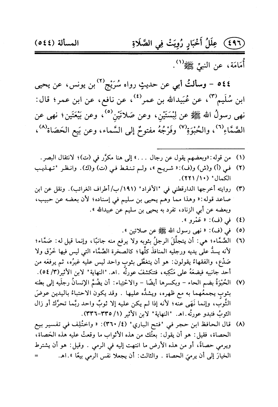 ٥٤٤- وسألتُ أَبِي عَنْ حديثٍ رَوَاهُ سُرَيْج (٢) ابن يُونُسَ، عَنْ يَحْيَى بْنِ سُلَيم (٣) ، عن عُبَيدالله ابن عُمَرَ (٤) ، عَنْ نَافِعٍ، عَنِ ابْنِ عُمَرَ؛ قَالَ: نَهَى رسولُ اللَّهِ (ص) عَنْ لِبْسَتَيْنِ، وَعَنْ صَلاتَيْنِ (٥) ، وَعَنْ بَيْعَتَين؛ نَهَى عَنِ الصَّمَّاءِ (٦) ، والحُبْوَةِ (٧) وفَرْجُهُ مفتوحٌ إِلَى السَّماء، وَعَنْ بَيع الحَصَاة (٨) ،