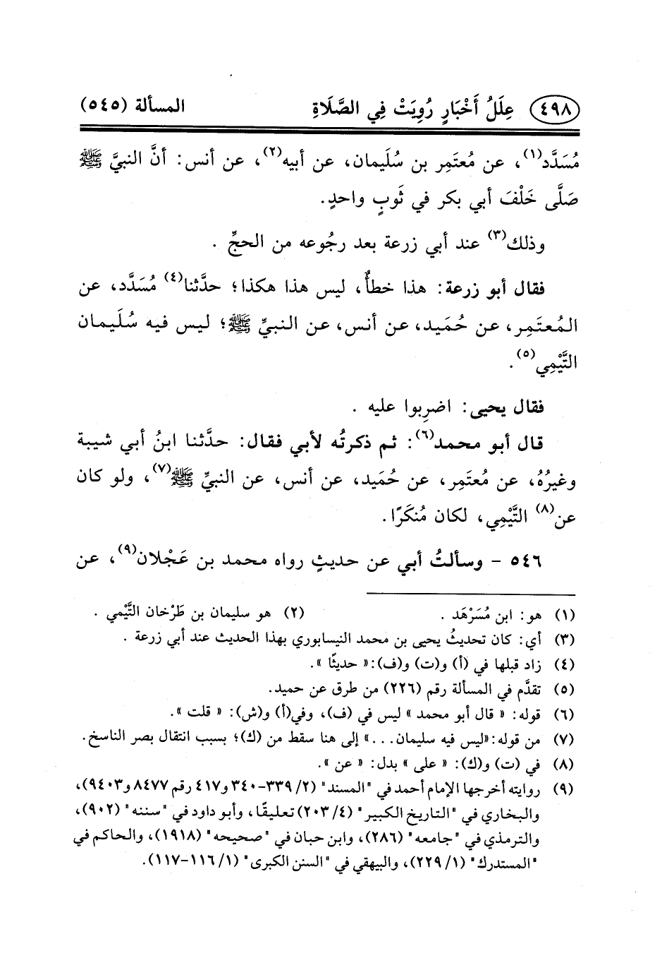 فَقَالَ أَبُو زُرْعَةَ: هَذَا خطأٌ، ليس هذا هكذا؛ حدَّثنا (٤) مُسَدَّد، عَنِ المُعتَمِر، عَن حُمَيد، عَنْ أَنَسٍ، عَنِ النبيِّ (ص) ؛ لَيْسَ فِيهِ سُلَيمان التَّيْمِي (٥) .