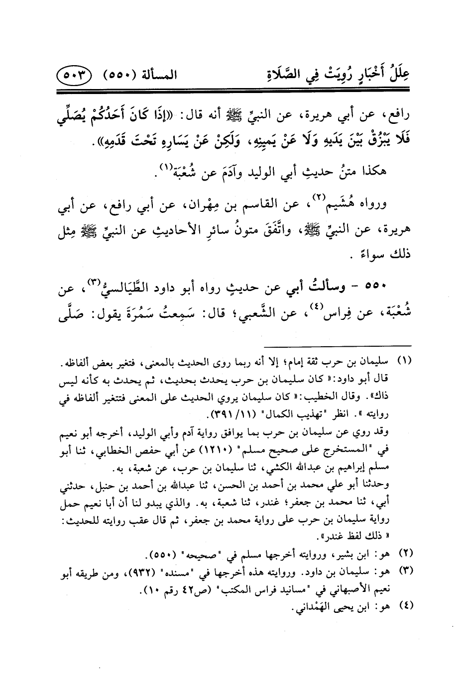 ٥٥٠ - وسألتُ أَبِي عَنْ حديثٍ رَوَاهُ أَبُو دَاوُدَ الطَّيَالسيُّ (٣) ، عَنْ شُعْبَة، عَنْ فِراس (٤) ، عَنِ الشَّعبي؛ قَالَ: سَمِعتُ سَمُرَةَ يقول: صَلَّى