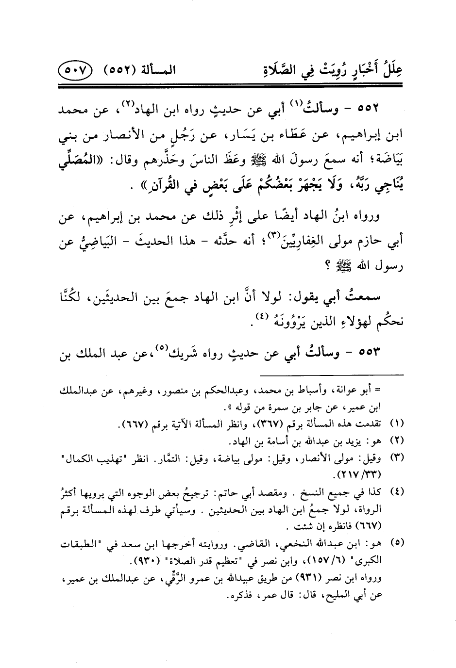 ٥٥٢ - وسألتُ (١) أَبِي عَنْ حديثٍ رَوَاهُ ابْنُ الْهَادِ (٢) ، عَنْ مُحَمَّدِ بْنِ إِبْرَاهِيمَ، عَنْ عَطَاء بْنِ يَسَار، عَنْ رَجُلٍ مِنَ الأَنْصَارِ مِنْ بَنِي بَيَاضَة؛ أَنَّهُ سمعَ رسولَ الله (ص) وعَظَ الناسَ وحَذَّرهم وَقَالَ: المُصَلِّي يُنَاجِي رَبَّهُ، وَلَا يَجْهَرْ بَعْضُكُمْ عَلَى بَعْضٍ في القُرآن ِ.