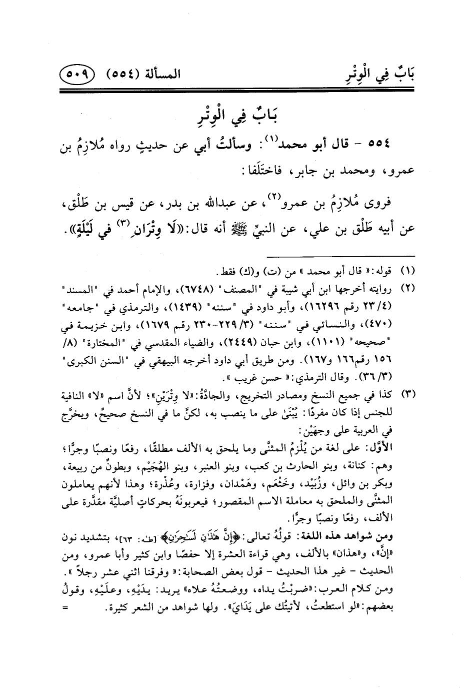 فروى مُلازِمُ بن عمرو (٢) ، عن عبد الله بْنِ بَدْرٍ، عَنْ قَيْسِ بْنِ طَلْق، عَنْ أَبِيهِ طَلْق بْنِ علي، عن النبيِّ (ص) أنه قال: لَا وِتْرَان ِ (٣)