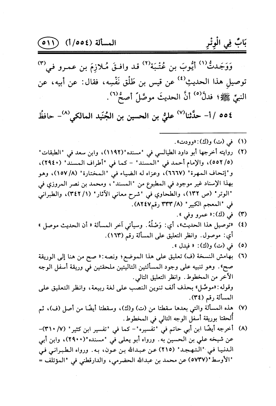 (٤) «توصيل هذا الحديث» ، أي: وَصْلُهُ. وسيأتي آخر المسألة «أن الحديث موصل» أي: موصول. وانظر التعليق على المسألة رقم (١٦٣) .