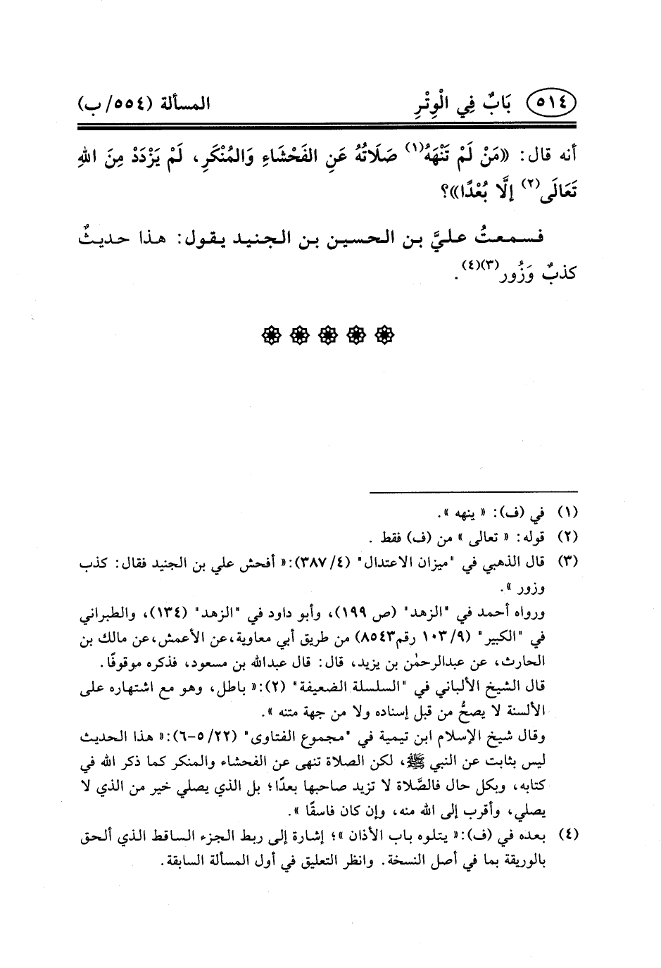 وقال شيخ الإسلام ابن تيمية في "مجموع الفتاوى" (٢٢/٥-٦) : «هذا الحديث ليس بثابت عن النبي (ص) ، لكن الصَّلاةَ تَنْهَى عَنِ الْفَحْشَاءِ وَالْمُنْكَرِ كما ذكر الله في كتابه، وبكل حال فالصَّلاة لا تزيد صاحبها بعدًا؛ بل الذي يصلي خير من الذي لا يصلي، وأقرب إلى الله منه، وإن كان فاسقًا» .