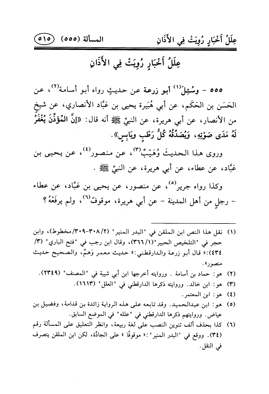 ٥٥٥ - وسُئِلَ (١) أَبُو زُرْعَةَ عَنْ حديثٍ رَوَاهُ أَبُو أُسَامَةَ (٢) ، عَنِ الحَسَن بْنِ الحَكَم، عَنْ أَبِي هُبَيرة يَحْيَى بْنِ عَبَّاد الأَنْصَارِيِّ، عَنْ شيخٍ مِنَ الأَنْصَارِ، عَنْ أَبِي هريرة، عن النبيِّ (ص) أَنَّهُ قَالَ: إنَّ المُؤَذِّنَ يُغْفَرُ لَهُ مَدَى صَوْتِهِ، وَيُصَدِّقُهُ كُلُّ رَطْبٍ ويَابِسٍ.