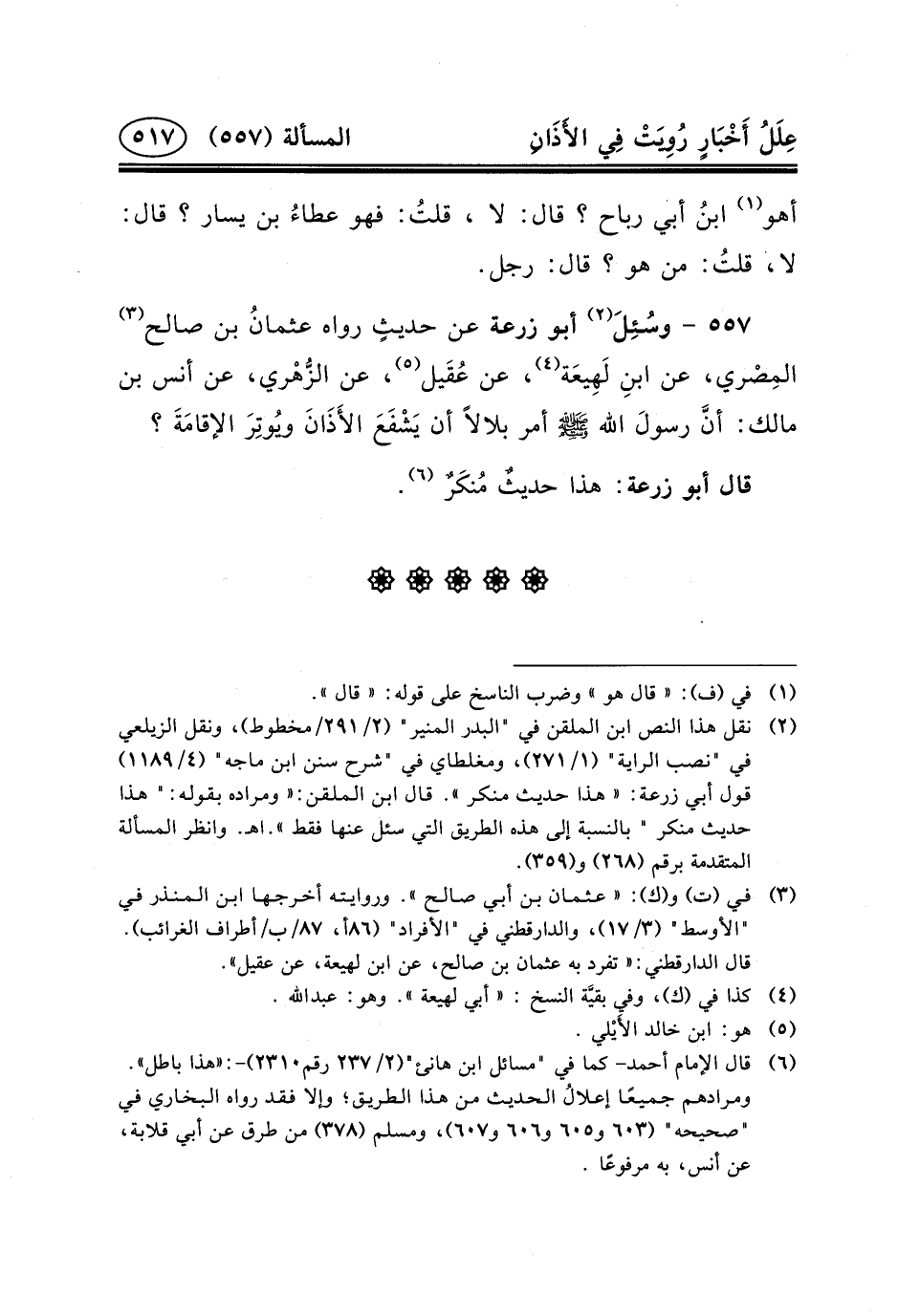 ٥٥٧ - وسُئِلَ (٢) أَبُو زُرْعَةَ عَنْ حديثٍ رَوَاهُ عثمانُ بْنُ صالِح (٣) المِصْري، عَنِ ابنِ لَهِيعَة (٤) ، عَن عُقَيل (٥) ، عَنِ الزُّهْري، عن أنس ابن مالك: أنَّ رسولَ الله (ص) أمر بلالا أن يَشْفَعَ الأَذَانَ ويُوتِرَ الإقامَةَ؟
