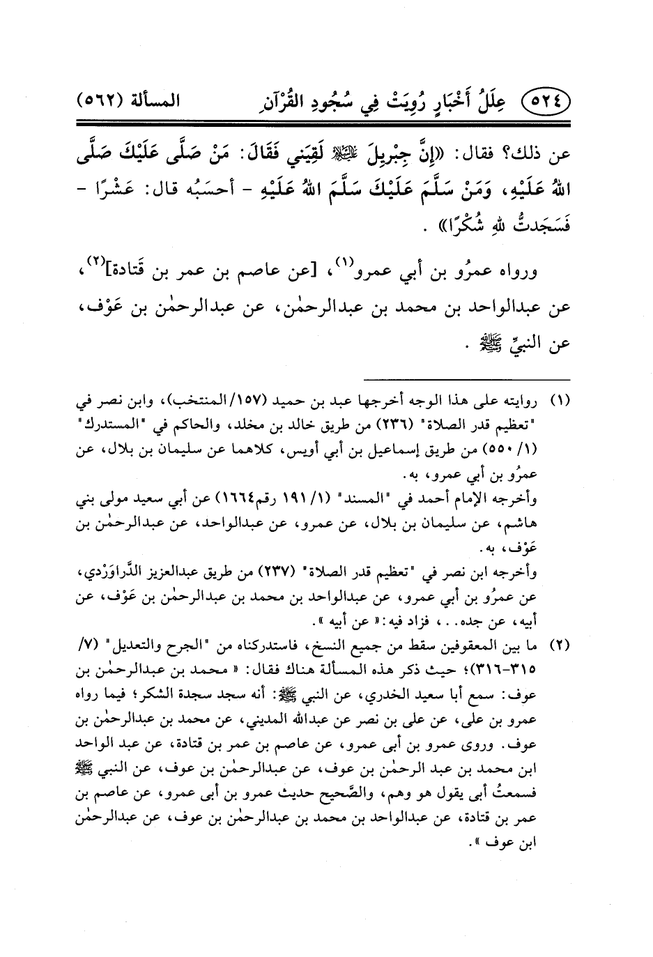 (٢) ما بين المعقوفين سقط من جميع النسخ، فاستدركناه من "الجرح والتعديل" (٧/٣١٥-٣١٦) ؛ حيث ذكر هذه المسألة هناك فقال: «محمد بن عبد الرحمن بْنِ عَوْفٍ: سَمِعَ أَبَا سَعِيدٍ الخدري، عن النبي (ص) : أنه سجد سجدة الشكر؛ فيما رَوَاهُ عَمْرُو بْنُ عَلِيٍّ، عَنْ على ابن نصر عن عبد الله المديني، عن محمد بن عبد الرحمن بن عوف. وروى عَمْرِو بْنِ أَبِي عَمْرٍو، عَنْ عَاصِمِ بْنِ عُمَرَ بْنِ قَتَادَةَ، عَنْ عَبْدِ الْوَاحِدِ بْنِ مُحَمَّدِ بْنِ عَبْدِ الرَّحْمَنِ بْنِ عَوْفٍ، عن عبد الرحمن بن عوف، عن النبي (ص) فسمعتُ أبى يقول هو وهم، والصَّحيح حديث عَمْرِو بْنِ أَبِي عَمْرٍو، عَنْ عَاصِمِ بْنِ عُمَرَ بْنِ قَتَادَةَ، عن عبد الواحد بن محمد بن عبد الرحمن بن عوف، عن عبد الرحمن ابن عوف» .