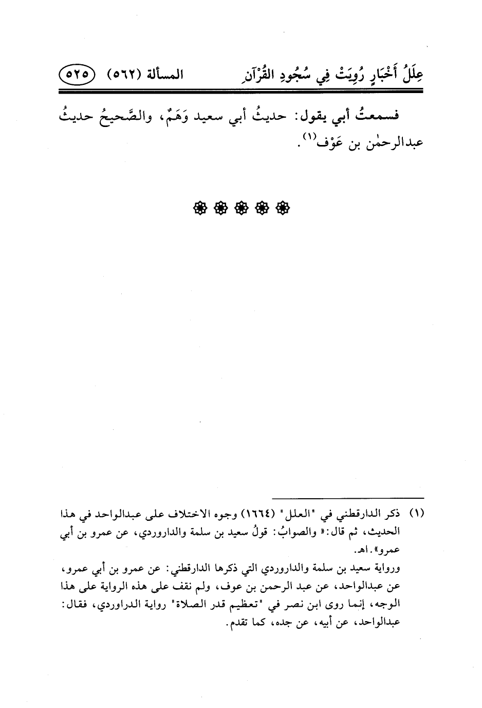 ورواية سعيد بن سلمة والداروردي التي ذكرها الدارقطني: عَنْ عَمْرِو بْنِ أَبِي عَمْرٍو، عن عبد الواحد، عَنْ عَبْدِ الرَّحْمَنِ بْنِ عَوْفٍ، ولم نقف على هذه الرواية على هذا الوجه، إنما روى ابن نصر في "تعظيم قدر الصلاة" رواية الدراوردي، فقال: عبد الواحد، عن أبيه، عن جده، كما تقدم.