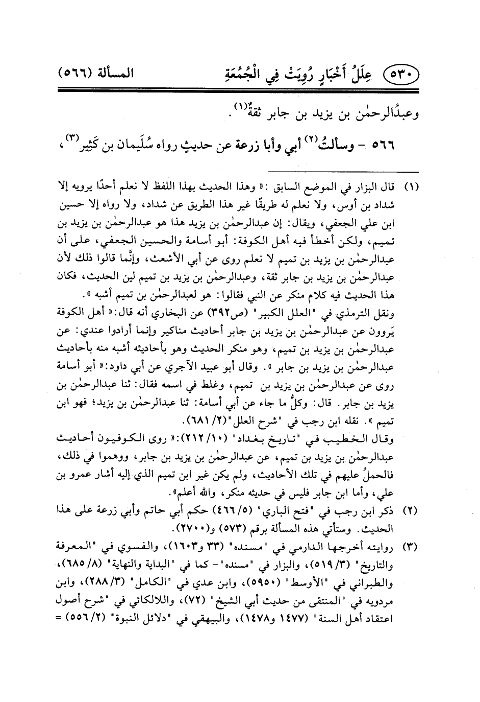 ونقل الترمذي في "العلل الكبير" (ص٣٩٢) عن البخاري أنه قال: «أهل الكوفة يَروون عن عبد الرحمن ابن يزيد بن جابر أحاديث مناكير وإنما أرادوا عندي: عن عبد الرحمن بن يزيد بن تميم، وهو منكر الحديث وهو بأحاديثه أشبه منه بأحاديث عبد الرحمن بن يزيد بن جابر» . وقال أبو عبيد الآجري عن أبي داود: «أبو أسامة روى عن عبد الرحمن بن يزيد بن تميم، وغلط في اسمه = = فقال: ثنا عبد الرحمن بن يزيد بن جابر. قال: وكلُّ ما جاء عن أبي أسامة: ثنا عبد الرحمن بن يزيد؛ فهو ابن تميم» . نقله ابن رجب في "شرح العلل" (٢/٦٨١) .