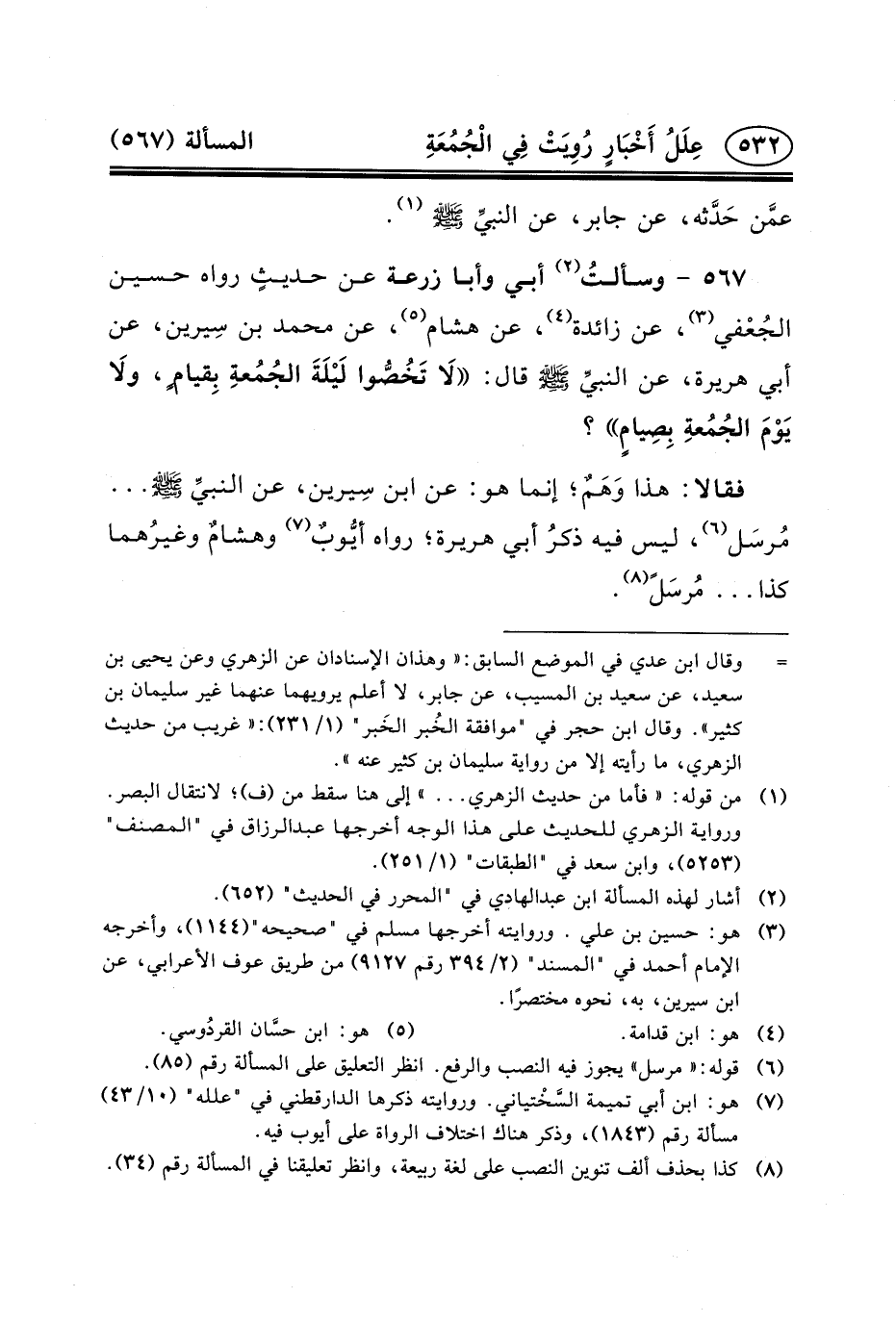 ٥٦٧ - وسألتُ (٢) أَبِي وَأَبَا زُرْعَةَ عَنْ حديثٍ رَوَاهُ حُسَيْنٌ الجُعْفي (٣) ، عَنْ زَائِدَةَ (٤) ، عَنْ هِشَامٍ (٥) ، عَنْ مُحَمَّدِ بْنِ سِيرين، عَنْ أَبِي هُرَيْرَةَ، عن النبيِّ (ص) قَالَ: لَا تَخُصُّوا لَيْلَةَ الجُمُعةِ بِقيام ٍ، ولَا يَوْمَ الجُمُعةِ بِصِيامٍ؟
