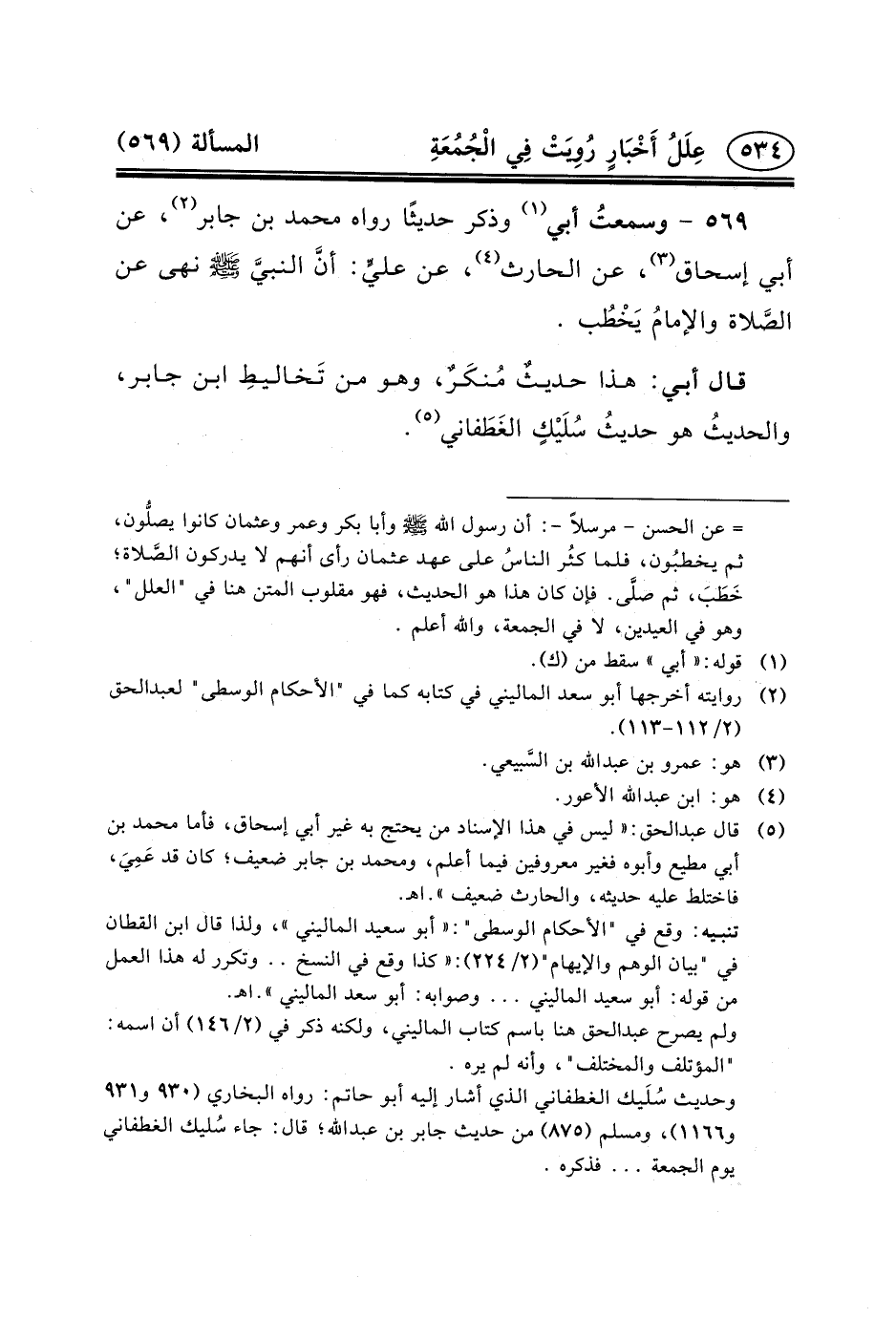 ٥٦٩ - وسمعتُ أَبِي (١) وَذَكَرَ حَدِيثًا رَوَاهُ مُحَمَّدُ بْنُ جَابِرٍ (٢) ، عَنْ أَبِي إِسْحَاقَ (٣) ، عَنِ الْحَارِثِ (٤) ، عَنْ عليٍّ: أنَّ النبيَّ (ص) نَهَى عَنِ الصَّلاة والإمامُ يَخْطُب.