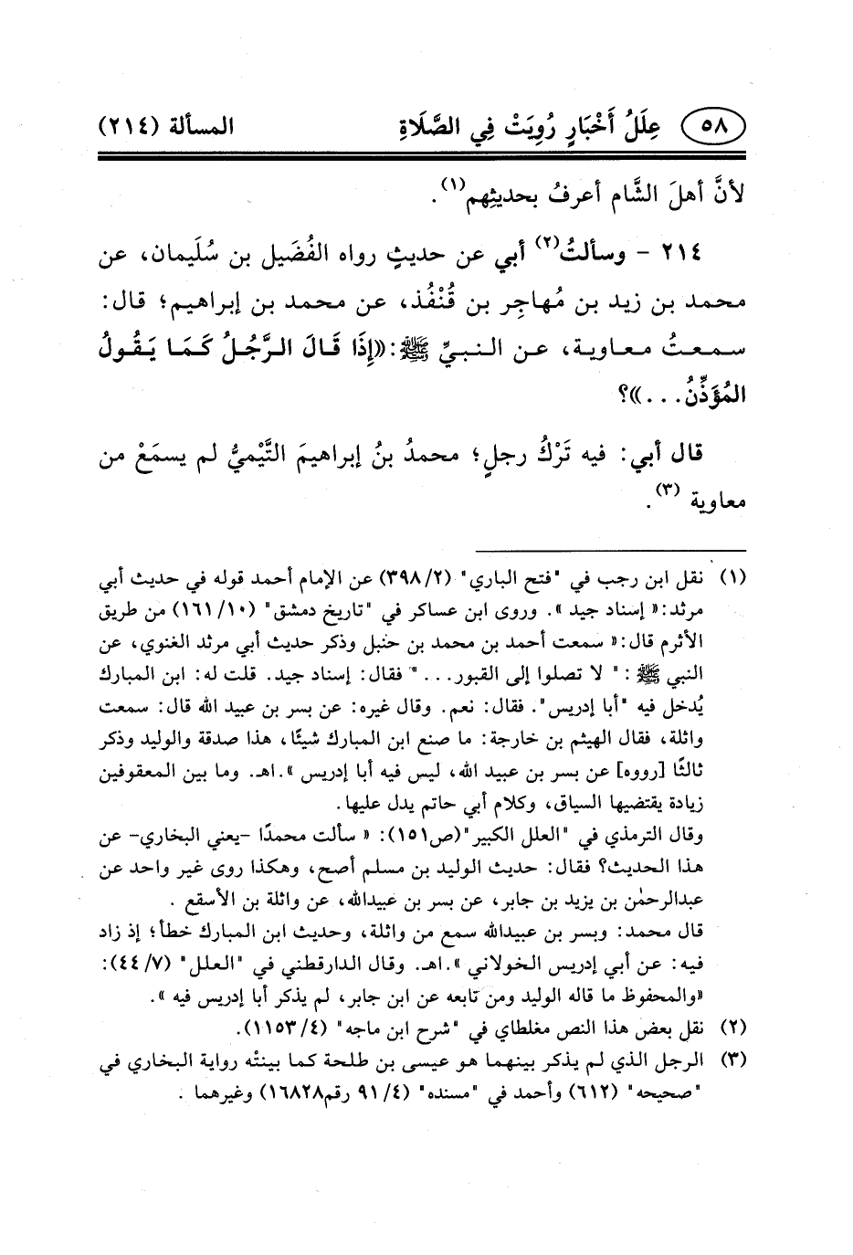 ٢١٤ - وسألتُ (٢) أَبِي عَنْ حديثٍ رَوَاهُ الفُضَيل بْن سُلَيمان، عَنْ مُحَمَّدِ بْنِ زيد بْن مُهاجِر بْن قُنْفُذ، عَنْ مُحَمَّدِ بْنِ إِبْرَاهِيمَ؛ قَالَ: سمعتُ معاوية، عَنِ النبيَِّ (ص) : إِذَا قَالَ الرَّجُلُ كَمَا يَقُولُ المُؤَذِّنُ ... ؟